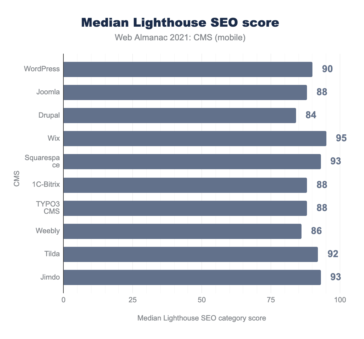 上位10プラットフォームのSEOスコアの中央値はすべて84を超えており、Drupalのスコアがもっとも低く、Wixのスコアがもっとも高く、中央値は95となっています。