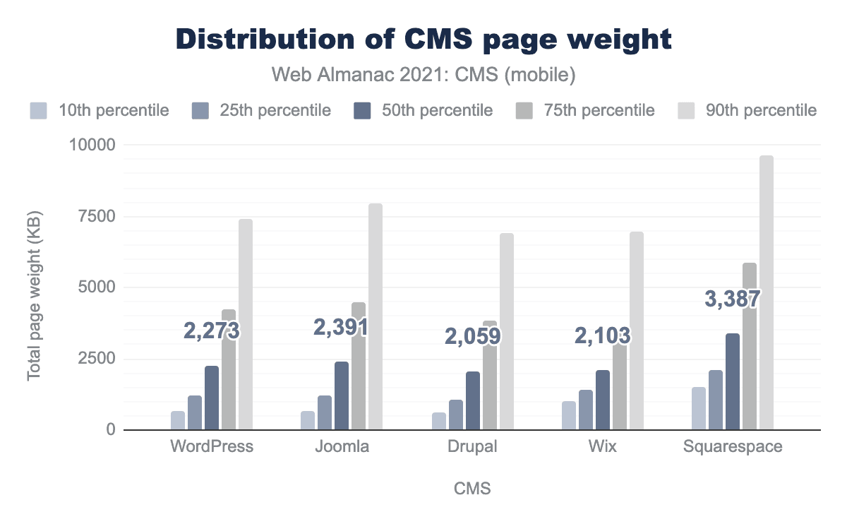 各プラットフォームのパーセンタイルにおけるページ重量の分布はかなり大きく、おそらく異なるウェブページ間のユーザーコンテンツの違い、使用されている画像の数、プラグインなどに関連していると思われます。プラットフォームごとに配信されるページがもっとも小さいのはDrupalで、10パーセンタイルの訪問に対して595KBしか送信されません。最大のページはSquarespaceで、90パーセンタイルの訪問で9.6MBが配信されました。