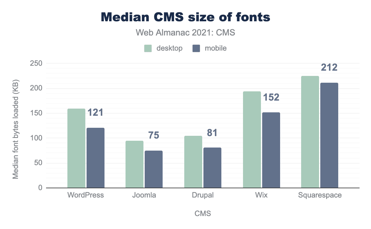 テキストを表示するために、ウェブ開発者は多くの場合、さまざまなフォントを使用することを選択します。Joomlaは、モバイルビューで75KBともっとも少ないフォントバイトを提供し、Squarespaceは212KBともっとも多いフォントバイトを提供しています。