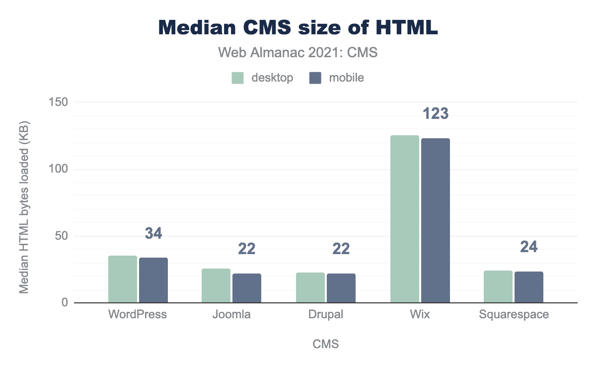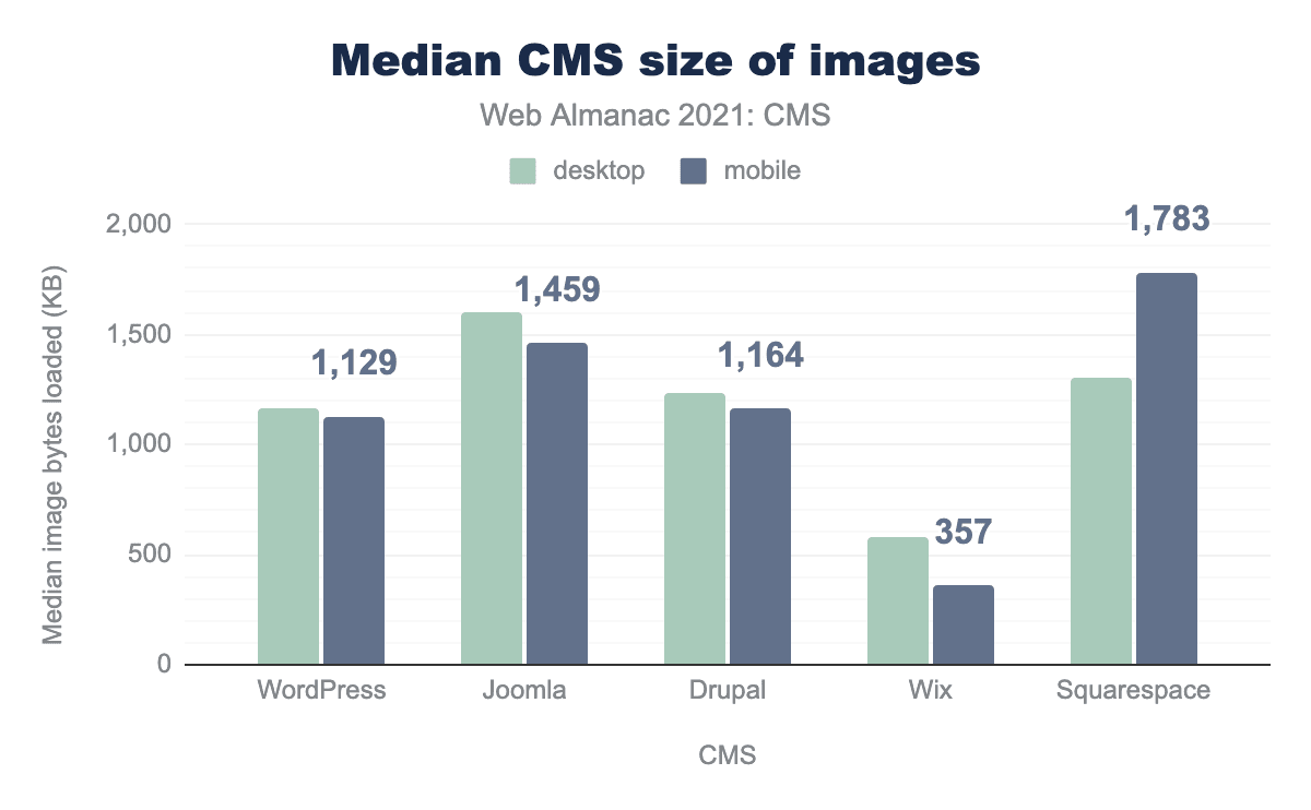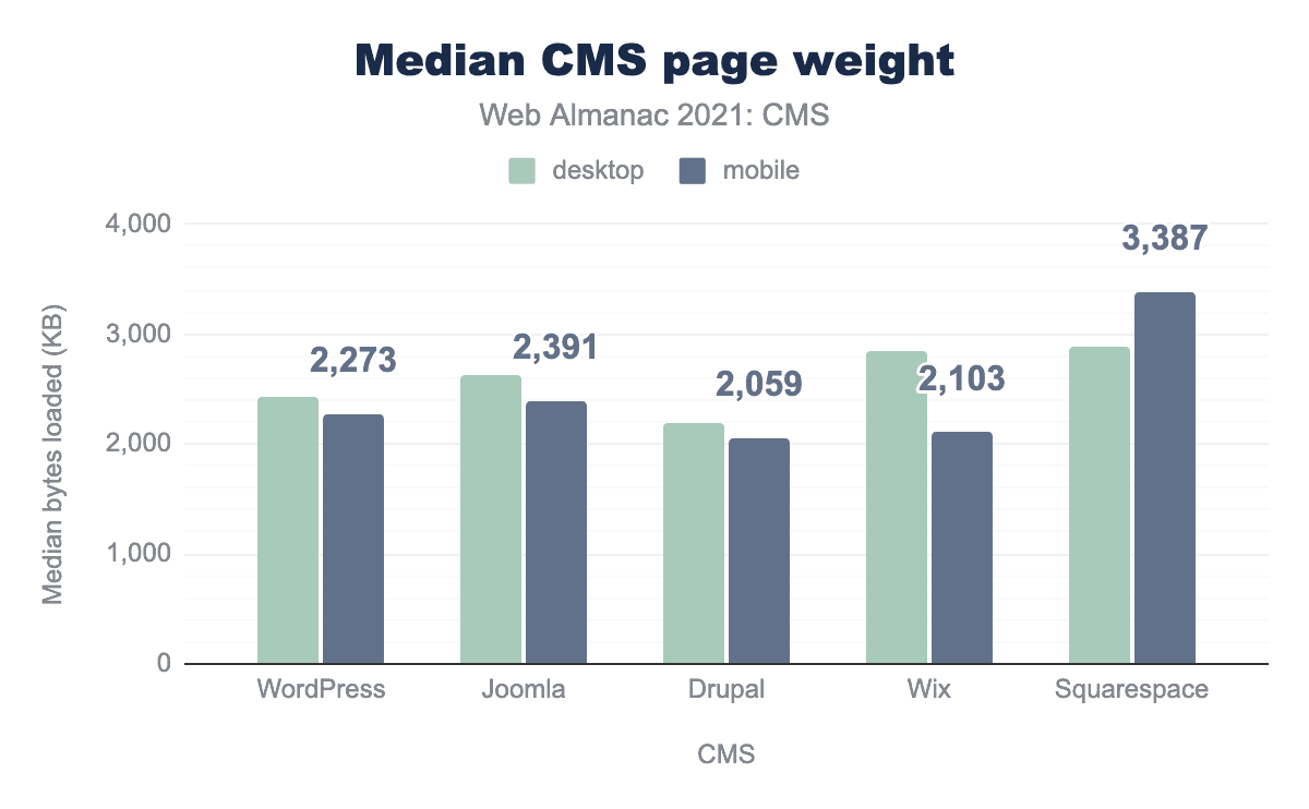 上位5つのCMSのページウェイトの中央値は、Squarespaceの3.3MBを除き、ほとんどが2MB程度です。Squarespaceは、デスクトップよりもモバイルでより多くのバイトを提供する唯一のプラットフォームです。