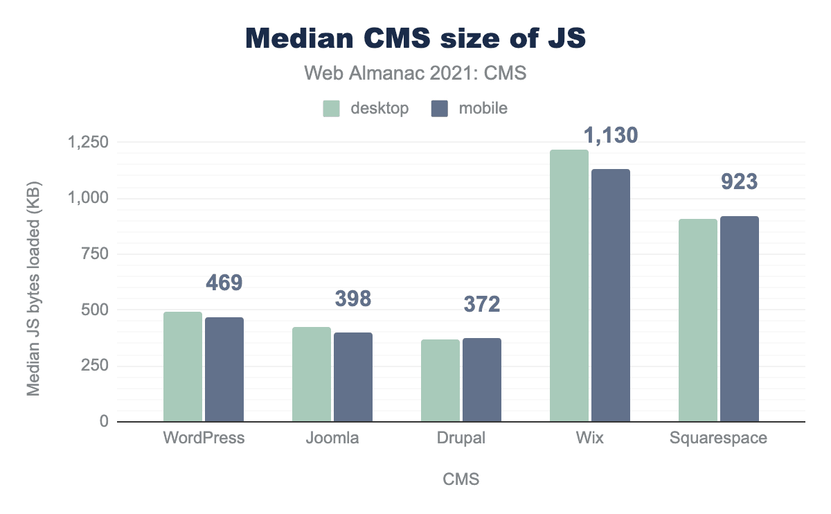 上位5つのCMSはすべてJavaScriptに依存したページを配信していますが、DrupalのJavaScriptバイト数はモバイルで372KBと少なく、Wixは1.1MB以上ともっとも多いJavaScriptバイトを配信しています。