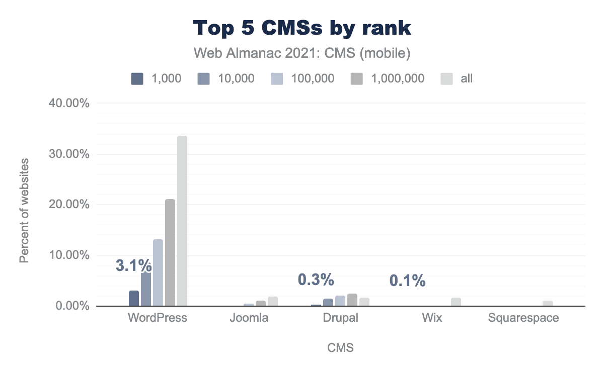 上位1Kのモバイルサイトの3.1%がWordPressで構築されており、全体の33.6%がWordPressで構築されています。Drupalはランキングの中位(10K~1M)内で高い採用率を維持しており、WixとSquarespaceのサイトはほとんどが上位1Mサイト外にランクインしています。