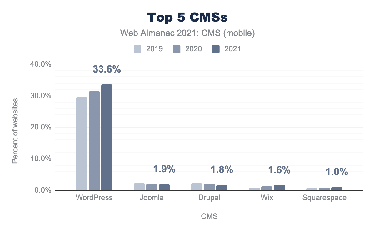 もっともよく使われているプラットフォームであるWordPressは、このうち33.6%が使用しており、2020年の31.4%から7%増加し、総導入数は増加しています。