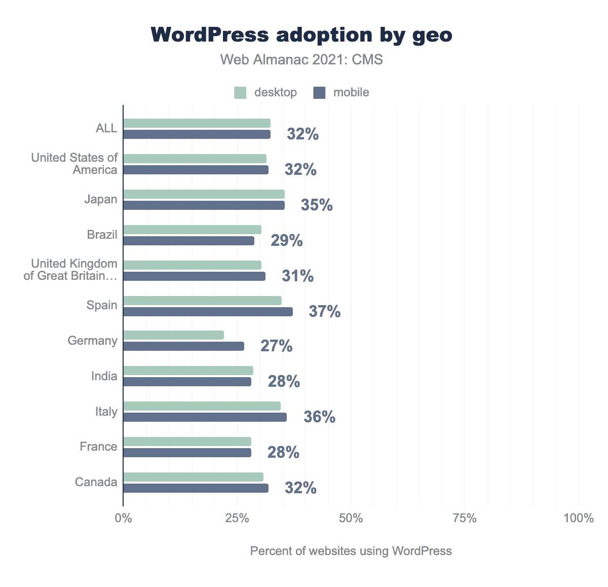 データセットに含まれるサイトの数が多い上位10カ国では、WordPressの導入率は27% 以上でした。スペインはこれらの国の中でもっともWordPressの普及率が高く、モバイルページの37%がWordPressを使用しているのに対し、ドイツでは28%しかWordPressが使用されていませんでした。