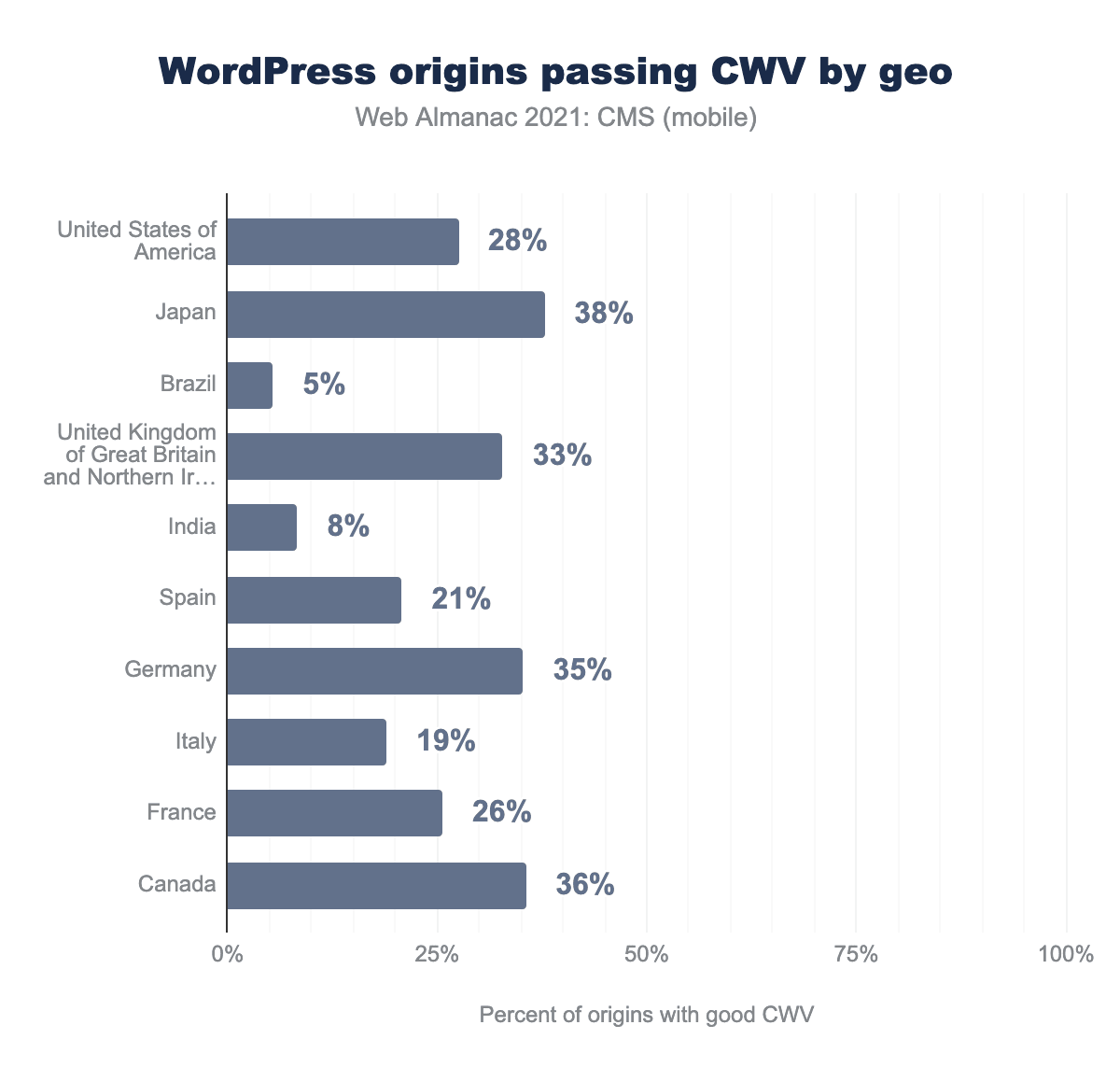 すべての国でカウントされたオリジンのうち、WordPressは19%で合格していましたが、WordPressサイトは国によって合格率が大きく異なります。日本では、38%のサイトがモバイル訪問者のための良いCWVを持っていますが、ブラジルでは、わずか5%のサイトが良いCWVを持っています。