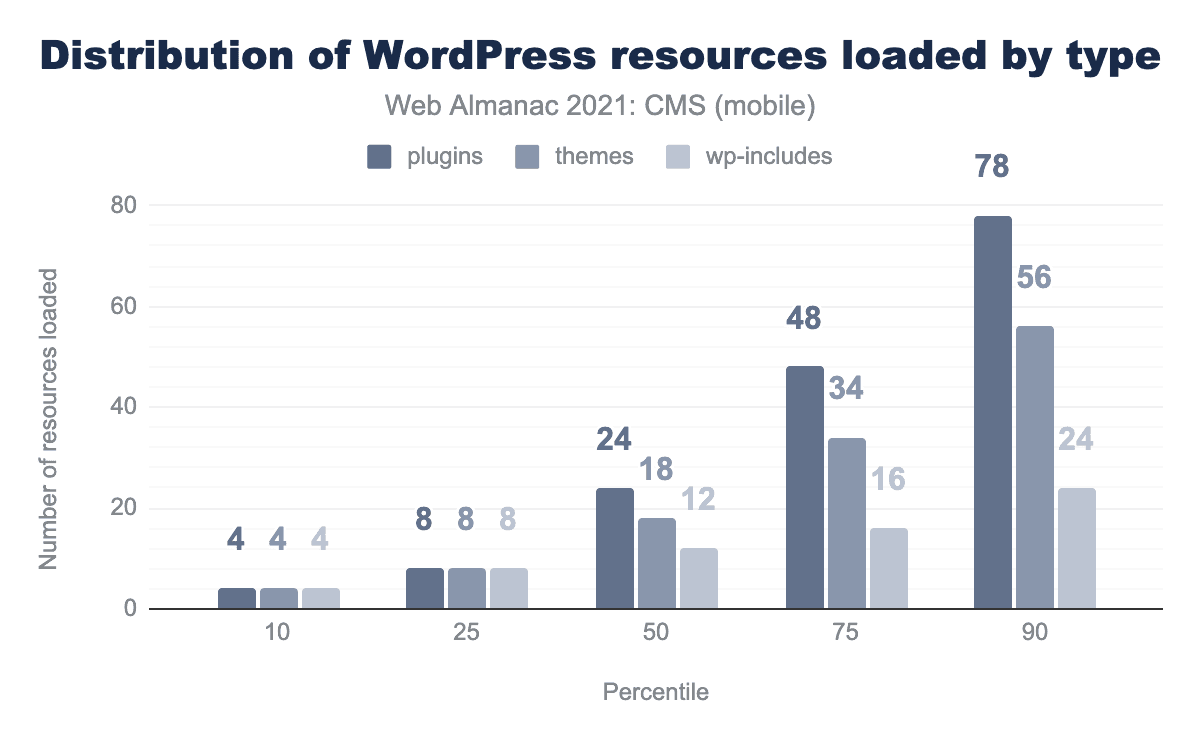 モバイルWordPressページの中央値では、/plugins/パスに24個のリソース、/themes/パスに18個のリソース、/wp-includes/パスに12個のリソースがロードされていることがわかります。90パーセンタイルでは、78個のプラグインリソース、56個のテーマ、24個のwp-includesと、膨大な量のリソースがリクエストされていることがわかります。