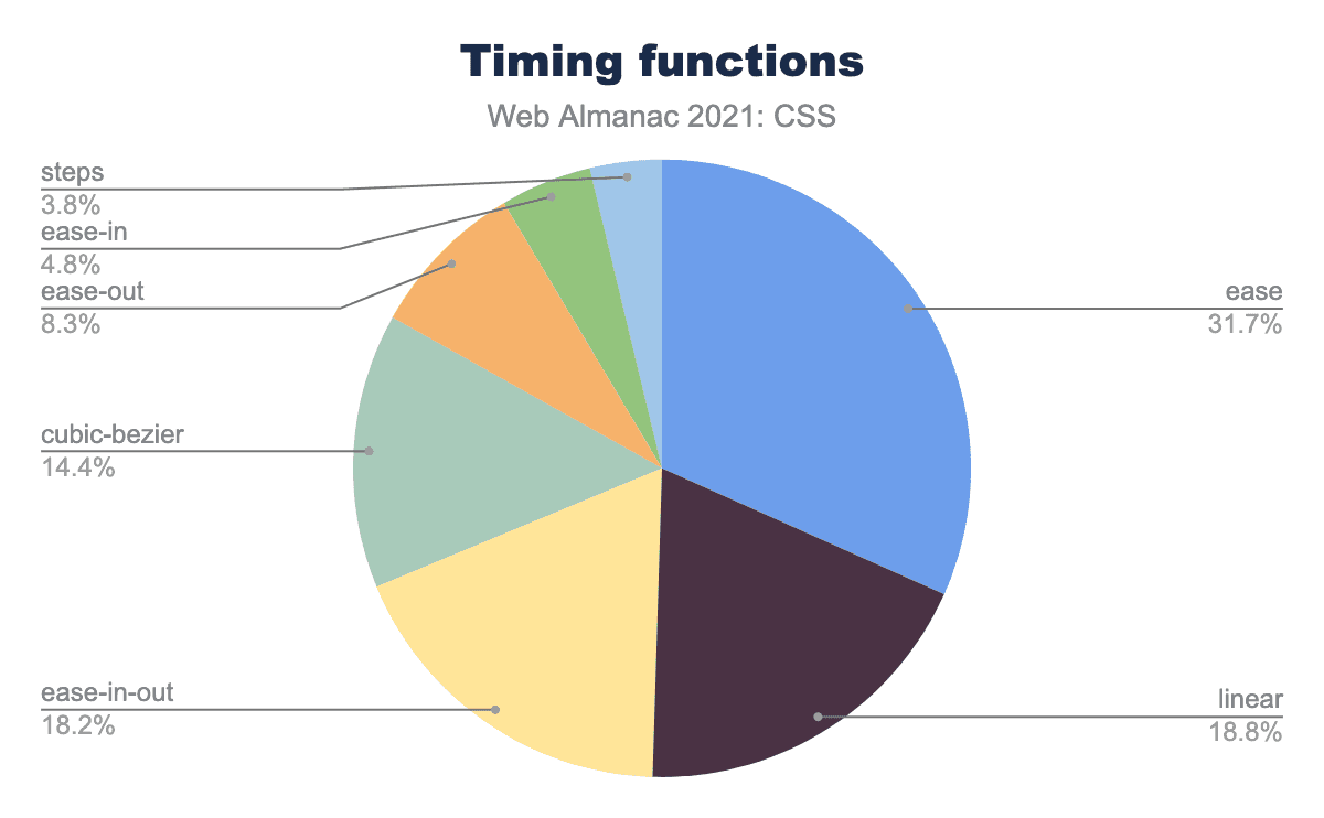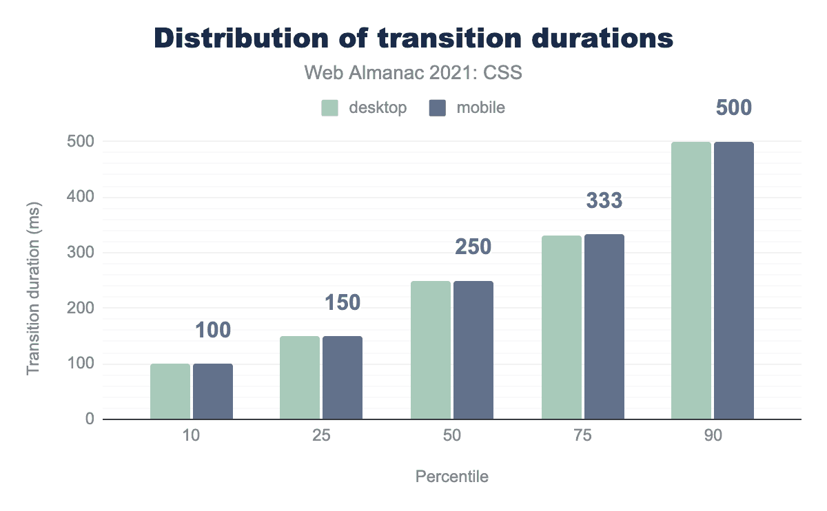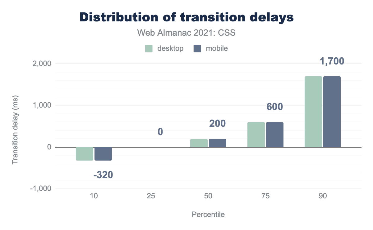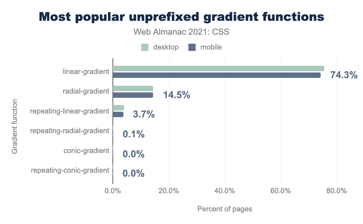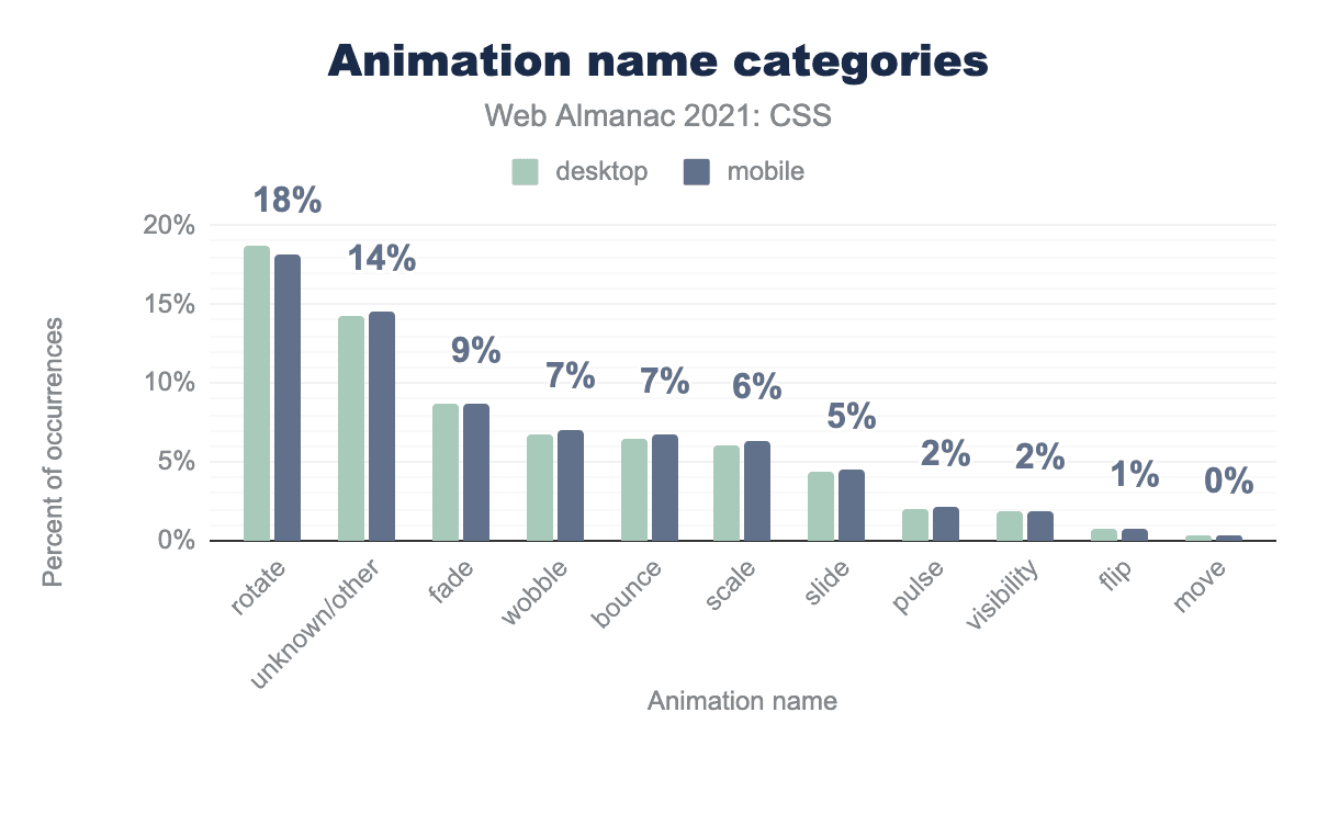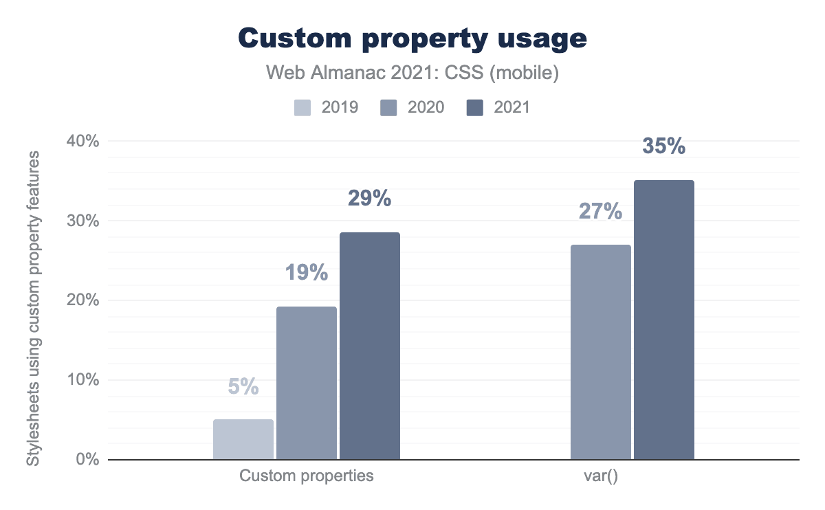 CSS Houdiniは、ある意味ではCSS-in-JSの逆を行くもので、作者がCSSに少しだけJSを混ぜることを可能にします。おそらく、仕様の中核部分の遅い実装(Blinkベースではないブラウザで)が原因で、Houdiniはその地位を確立するのに苦労しています。 We find that it’s effectively not used on the open web in 2021: only 1,030 desktop pages and 1,175 mobile pages show evidence of animated custom properties, a feature of Houdini. This is a threefold increase over the 2020 findings, but it looks like it will still be some time before Houdini finds an audience。