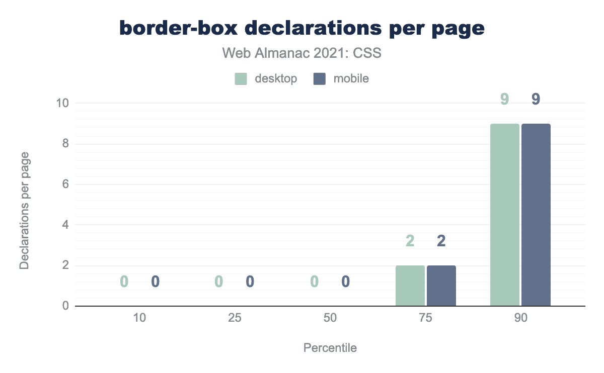 多くのCSSメソドロジーでは、作者が単一のクラスに限定することを推奨しています。これは、すべてのセレクターの特異性を、より管理しやすい単一のレイヤーに押し込めるためです。たとえば、BEMの手法は、全ページの34%に見られました。セレクターの特異性の中央値の10パーセンタイルは、デスクトップとモバイルの両方の特異性の平均値が(0,1,0)であることから、この種の考え方のさらなる証拠を示しています。これは昨年の調査結果と同様で、ほぼすべての中央値が一致しています。ただし、モバイルの25パーセンタイルは若干上昇しています。