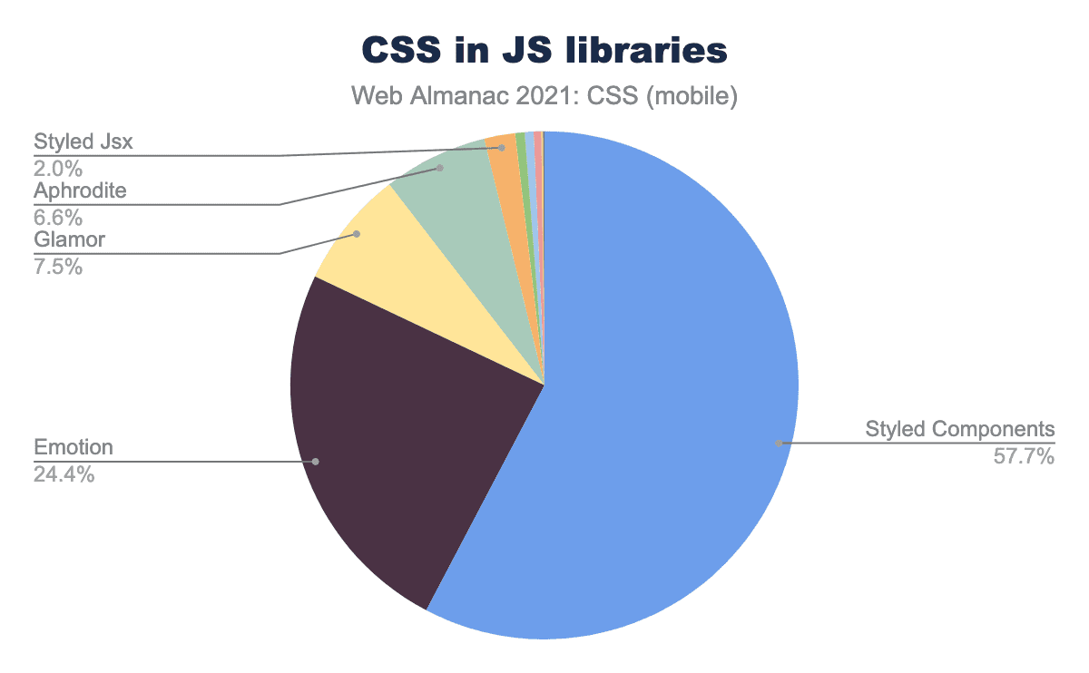 『CSS in JS」の話題は、少なくともTwitterでの炎上騒ぎの1つや2つにはもってこいですが、自然界での使用は非常に少ない状態が続いています。今年の調査では、ページの約3%が何らかの形でCSS-in-JSを使用していることがわかりましたが、これは2020年の2%から増加しています。さらに、そのほぼすべてがこの目的のために構築されたライブラリによるものであり、その半分以上がStyled Componentsライブラリによるものです。