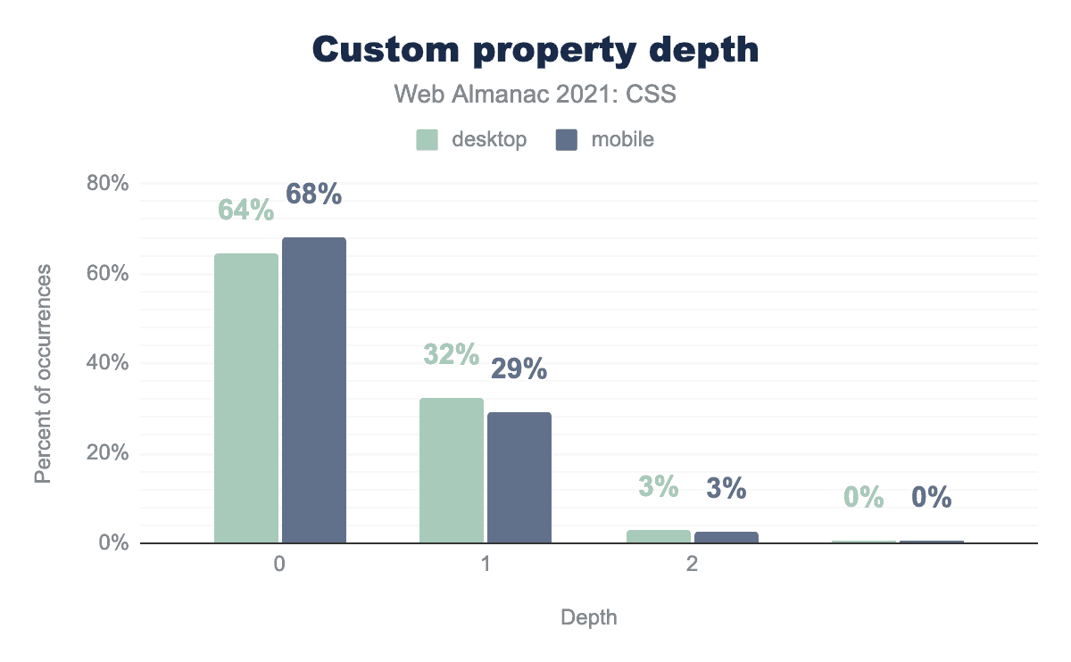 意外かもしれませんが、カスタムプロパティの値の深さは0のものが圧倒的に多く、他のカスタムプロパティの値を自分の値に含めていません。3分の1近くは値の深さが1段階で、2段階以上の値を持つカスタムプロパティはほとんどありません。