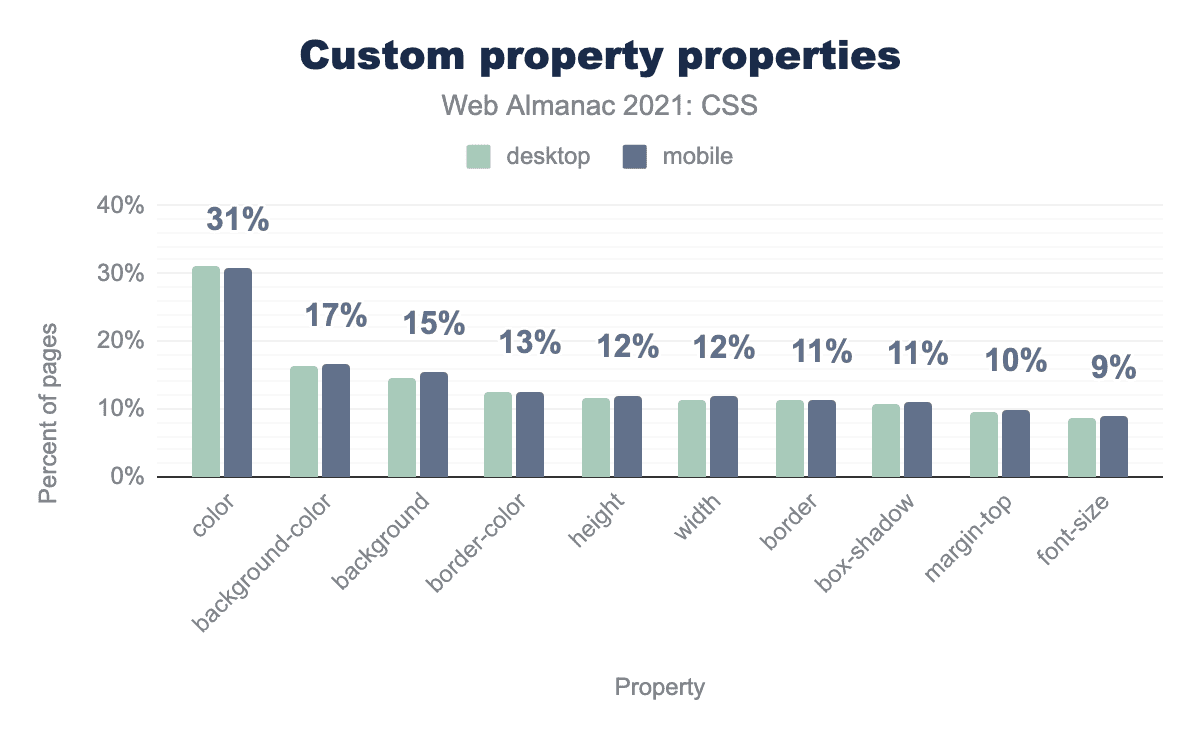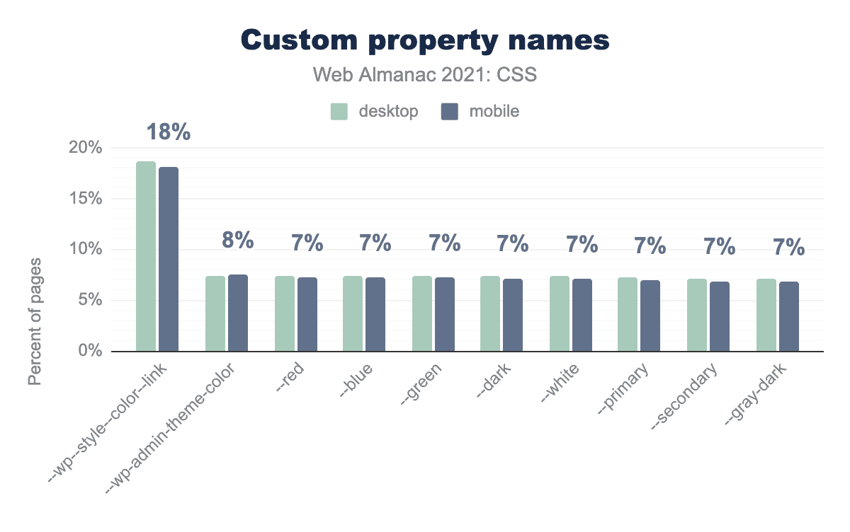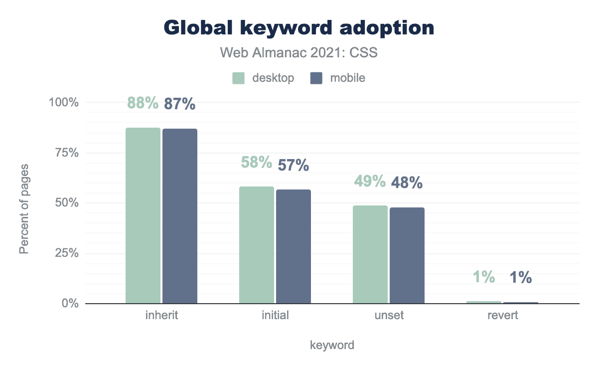 2020年版Web Almanacと比較して、initialなどのグローバルキーワードの使用率が大幅に上昇しました。 inheritは2~3ポイントしか上昇していませんが、initialは約8ポイント、unsetは約10ポイント上昇しています。また、revertも1ポイント上昇しました。