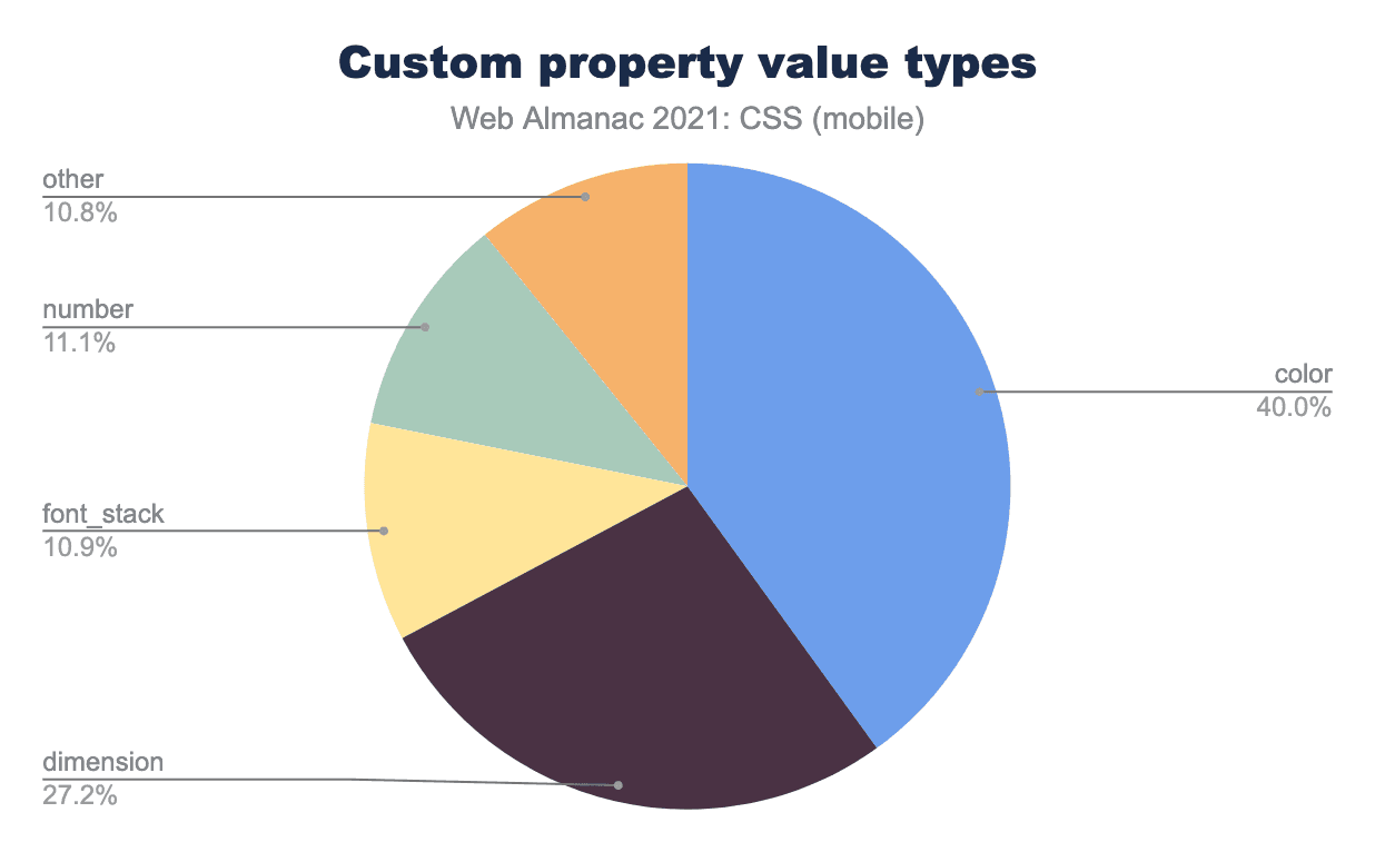 2020年と同様に、カスタムプロパティの値が使用されているセレクターも確認しました。約60%がルート要素(:rootまたはhtmlセレクターを使用)に設定されており、約5%が<body>要素に適用されていました。残りは、ルート要素の子孫である <body> 以外の要素に適用されています。つまり、全カスタムプロパティの約3分の2が、実質的にグローバルな定数として使用されていることになります。これは、昨年の結果と同じです。