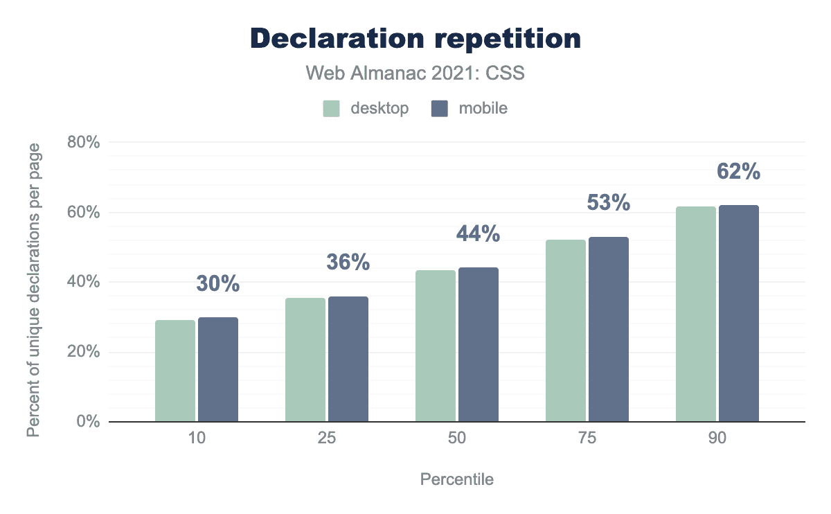 2020年版Web Almanacでは、「宣言の繰り返し」の量を分析しています。これは、同じプロパティや値を使用している宣言がいくつあるか、ページのスタイル内でユニークな宣言がいくつあるかを判断することで、スタイルシートの効率を大まかに見積もるための指標です。