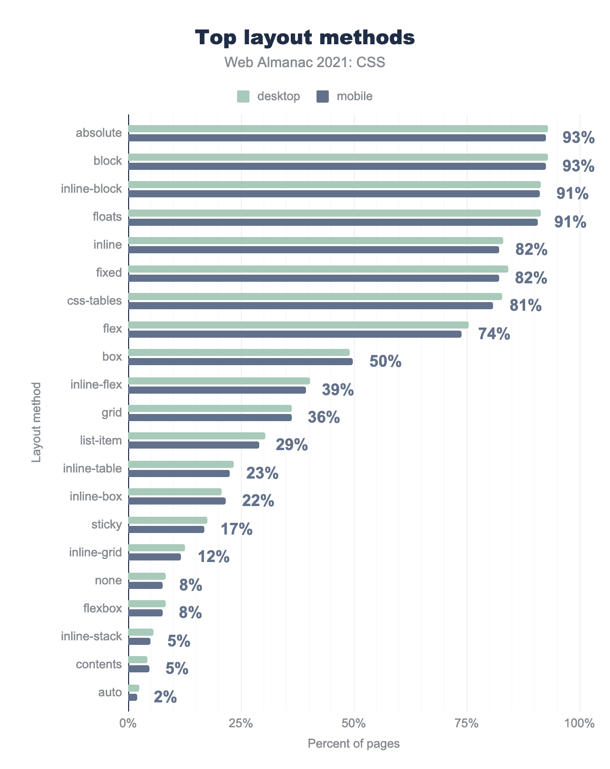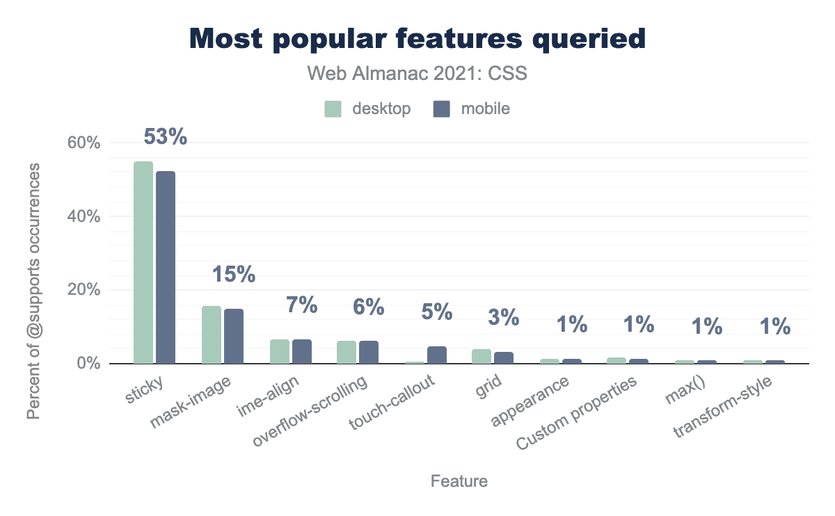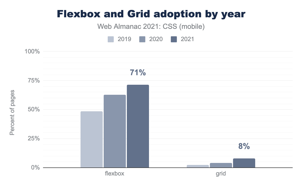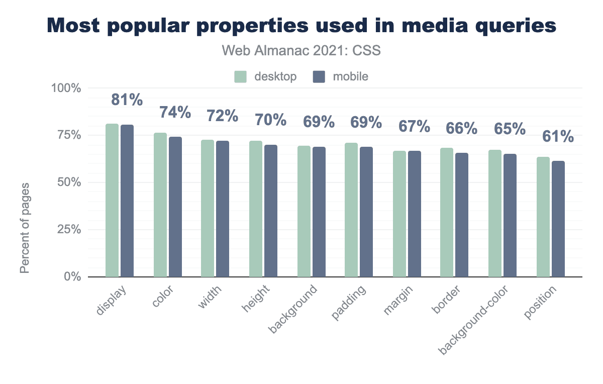 この数字には、モバイルではflex-basisの使用率が2倍になる一方、デスクトップではあまり変化がないなど、昨年と比較して大きな変動があることに留意する必要があります。これは、モバイル開発で使用される共通のフレームワークが変更されたことによるものかもしれませんし、その他の要因によるものかもしれません。