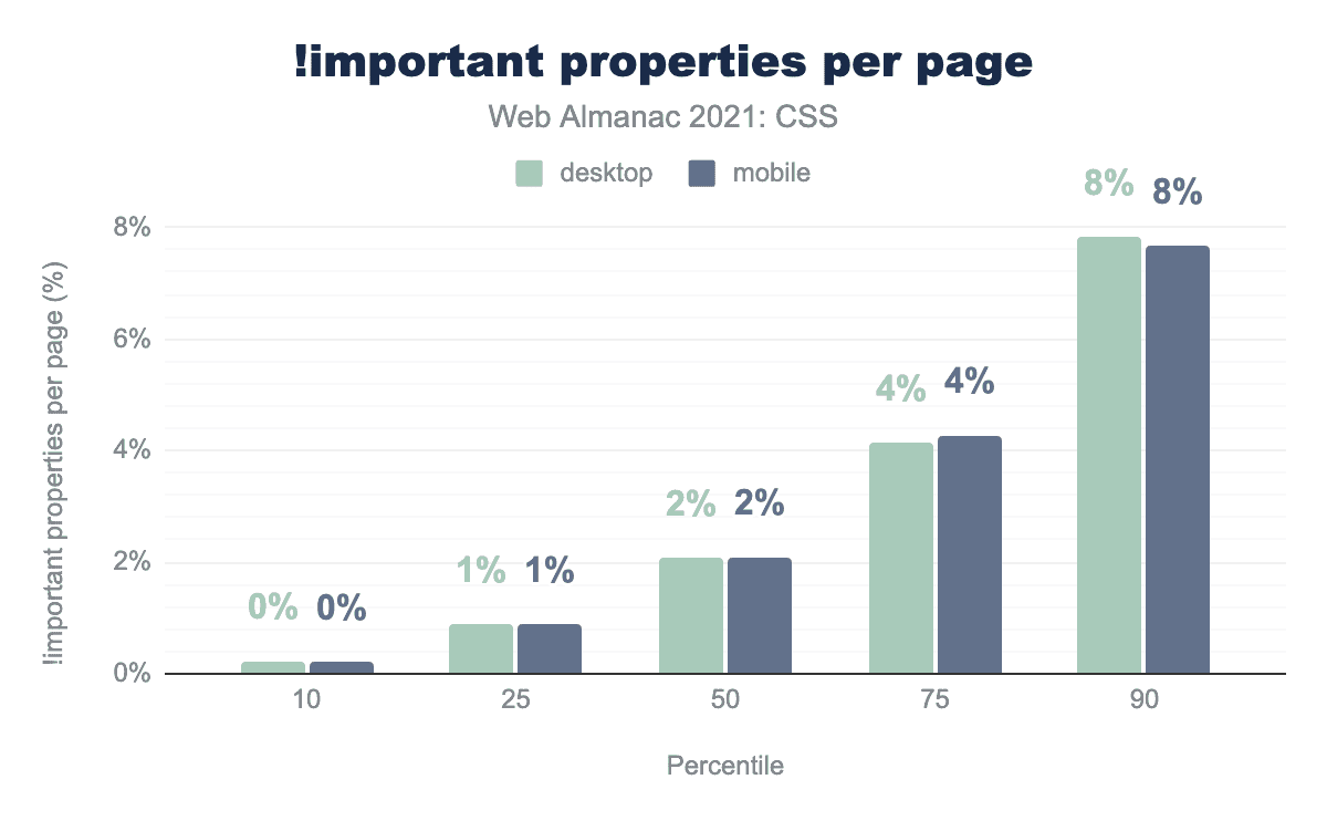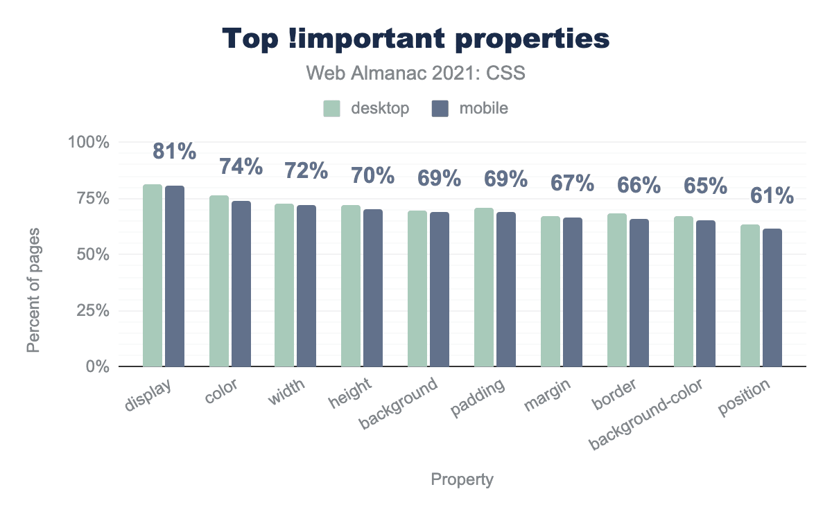 その古い戦斧 !important は、2020年のWeb Almanacと比較して、マークされたルールのシェアがほとんど変わらず、ウェブ上で持ちこたえています。