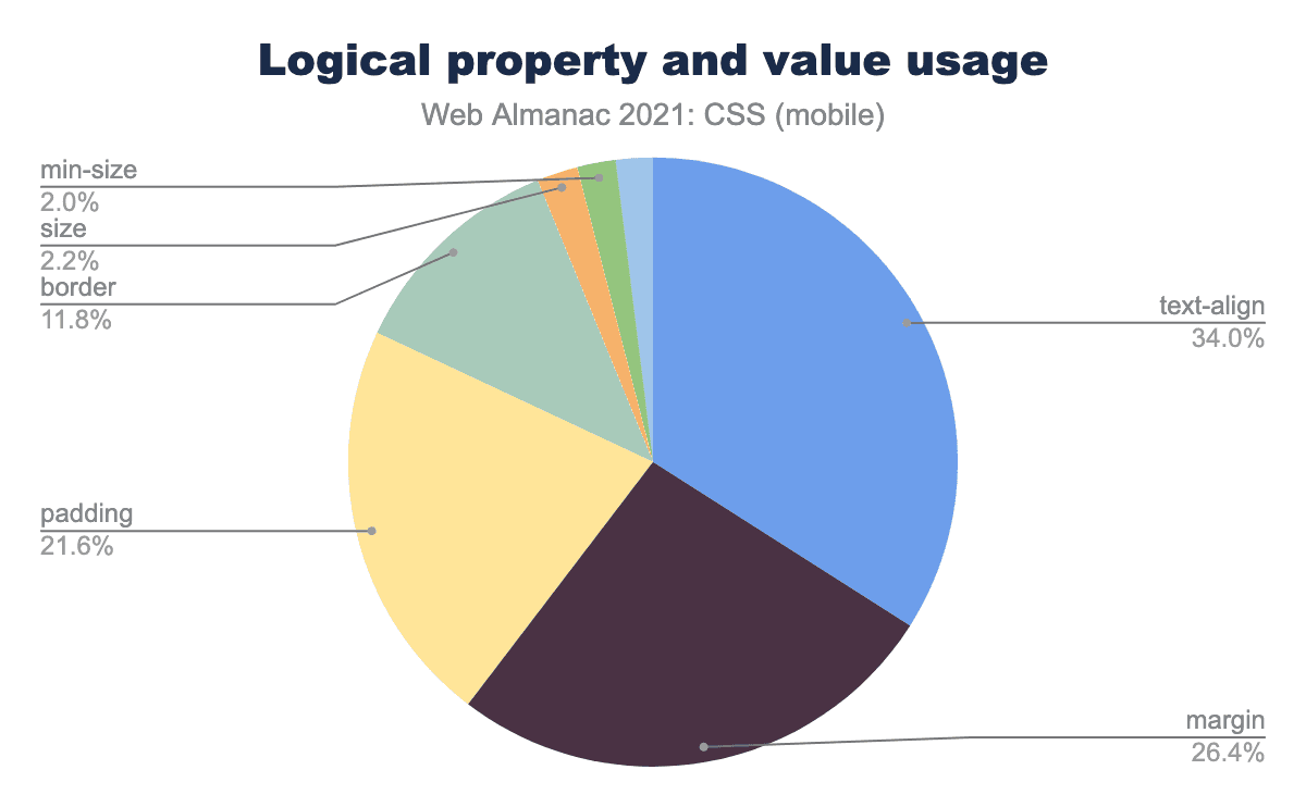 2021年半ばの時点で、何らかの論理的プロパティを使用しているページは、わずか4%でした。使っているページのうち、約33%がtext-alignstartendへ設定するために使っていました。また、46%ほど(合計)が論理的なマージンやパディングを設定していました。繰り返しになりますが、これらの数字は重複してる可能性があります。