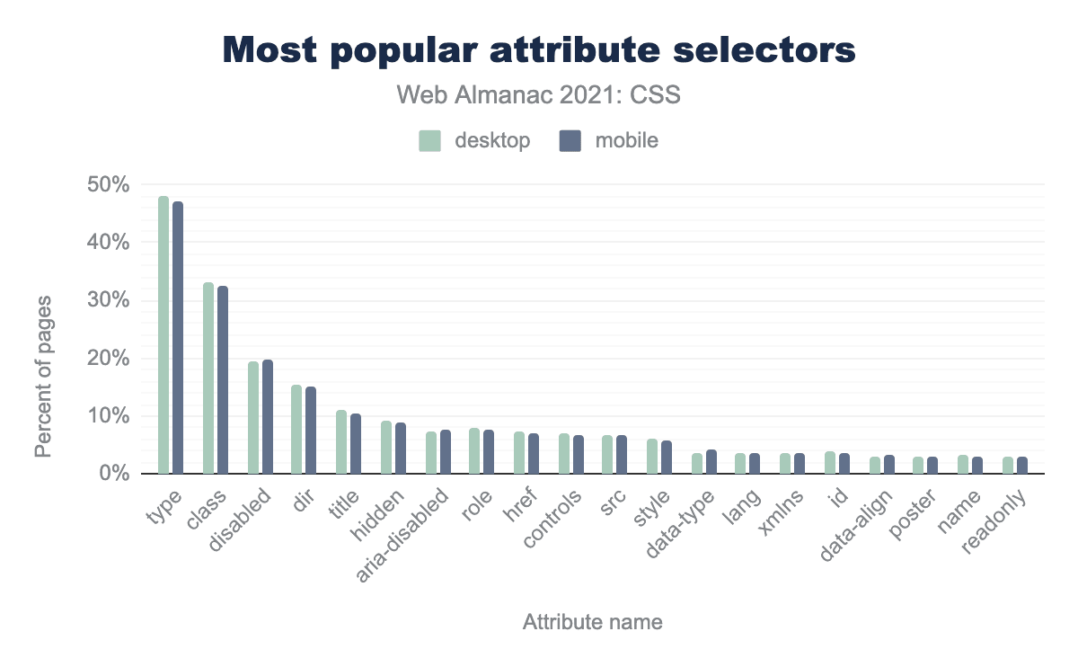 もっとも一般的な属性セレクターは引き続き type で、チェックボックスやラジオボタン、テキスト入力などのフォームコントロールを選択する際に使用されることが多いです。