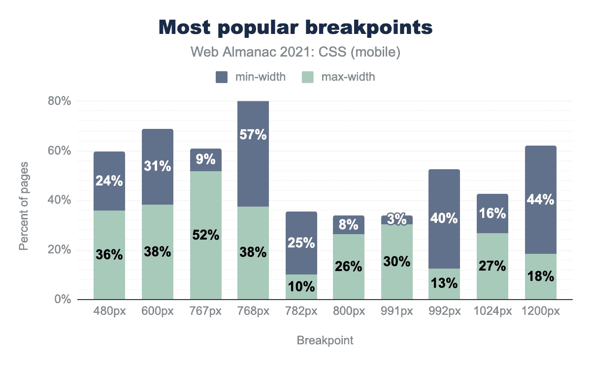 CSS-in-JSの採用は、クロールされた全ページの3%(昨年比1パーセントポイント増)にまで増加しましたが、最先端のHoudiniの機能は、まだほとんどがチュートリアルやサンプルギャラリーに限られています。レスポンシブ対応は、引き続きもっとも関心の高い優先事項の1つであり、max-widthmin-widthはトップのメディアクエリであり、「calc()」は幅を決定するためにもっともよく使用されるCSS関数です。