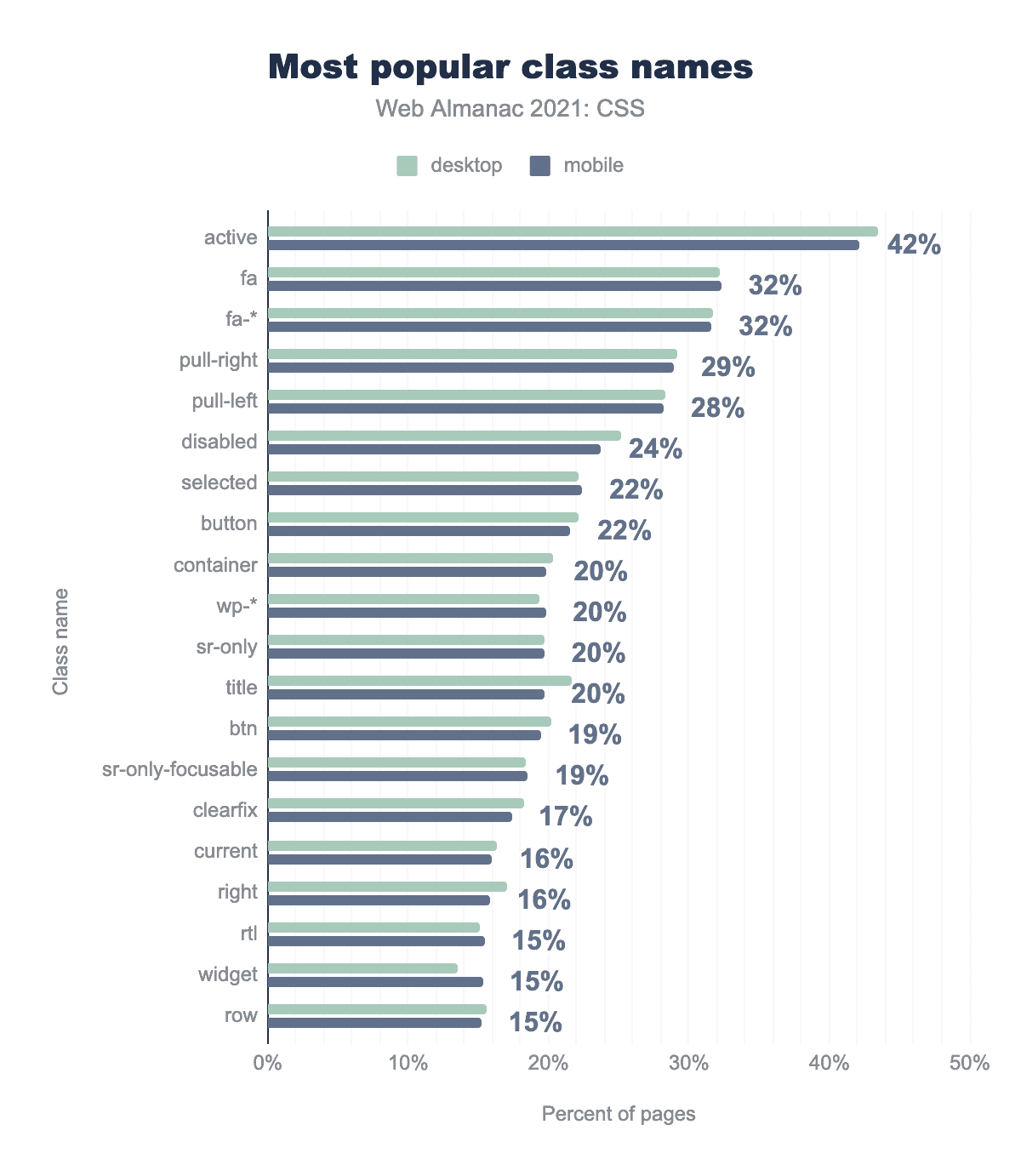 昨年同様、もっとも人気のあるクラス名は active で、fafa-*(Font Awesomeのプレフィックス)、wp-*(WordPressのプレフィックス)のクラス名が非常に強い印象を与えています。selecteddisabledは昨年と比べて順位が入れ替わっていますが、もっとも心強い変化はclearfixが5%減少したことで、フロートベースのレイアウトが衰退し続けていることを示しています。