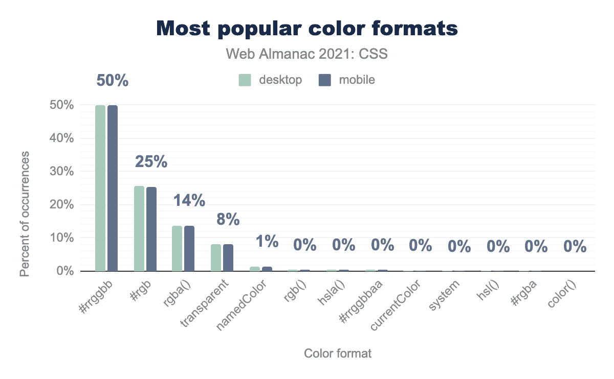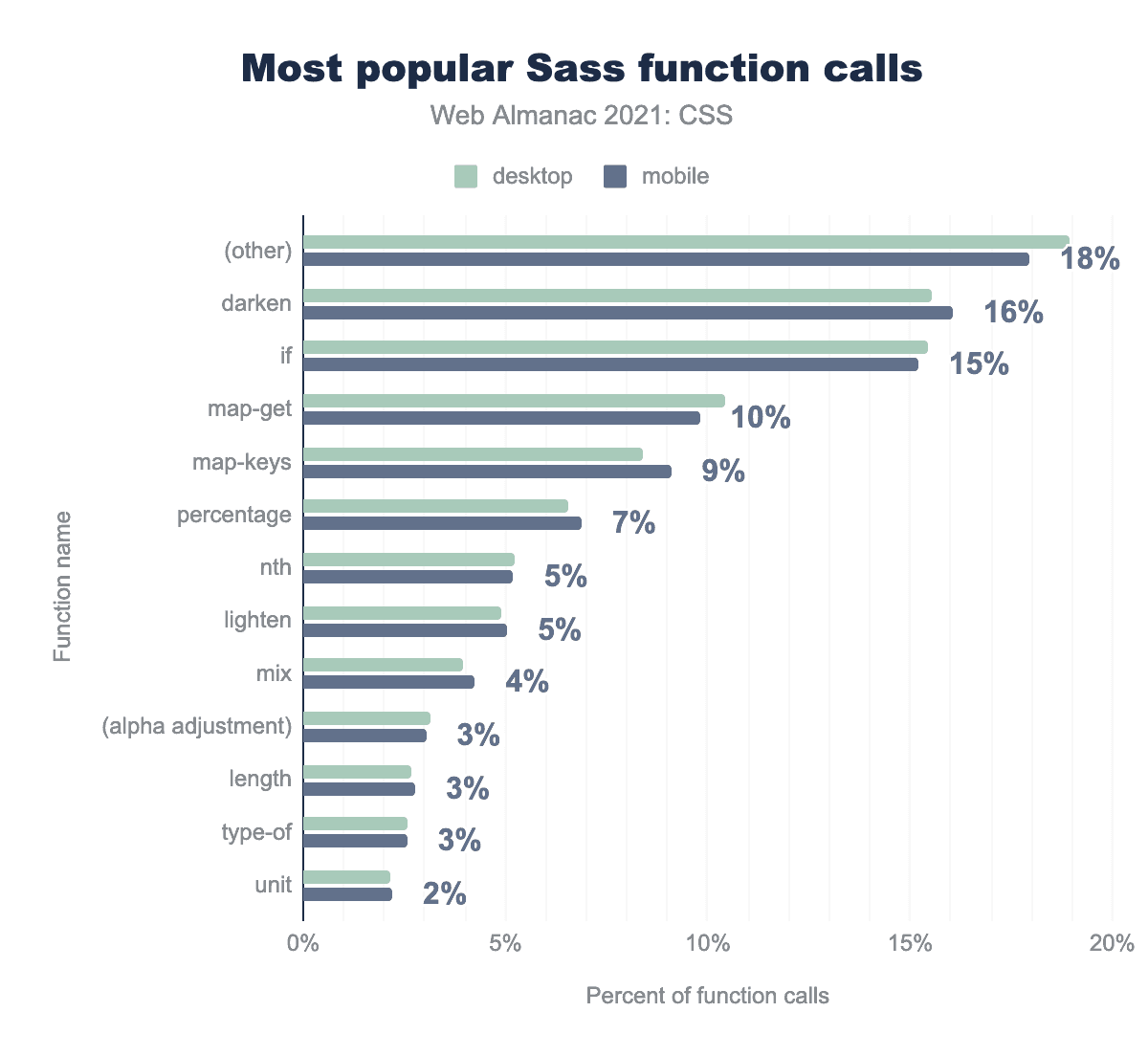 使用されているSass関数は、比率に若干の変更はあるものの、2020年版Web Almanacで見つかったものとほぼ同じでした。タイプ別に分類すると、全Sass関数の28%が色を変更するもの(例:darkenmix)で、さらに6%が色成分を読み取るために使用されていることがわかりました(例:alphablue)。