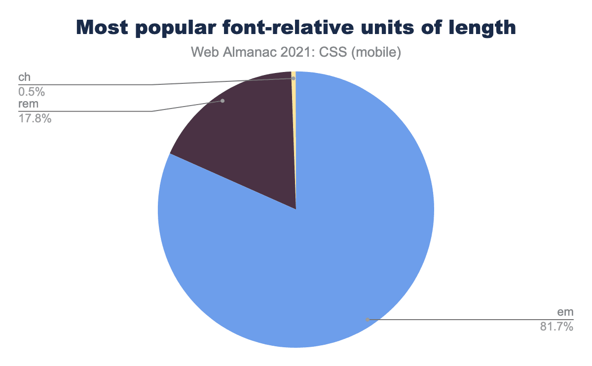 フォントのサイジングに関しては、emremに対して圧倒的な優位性を保っていますが、変化の兆しもあります。2020年から2021年にかけて、emからremへ7ポイントの変動がありました。