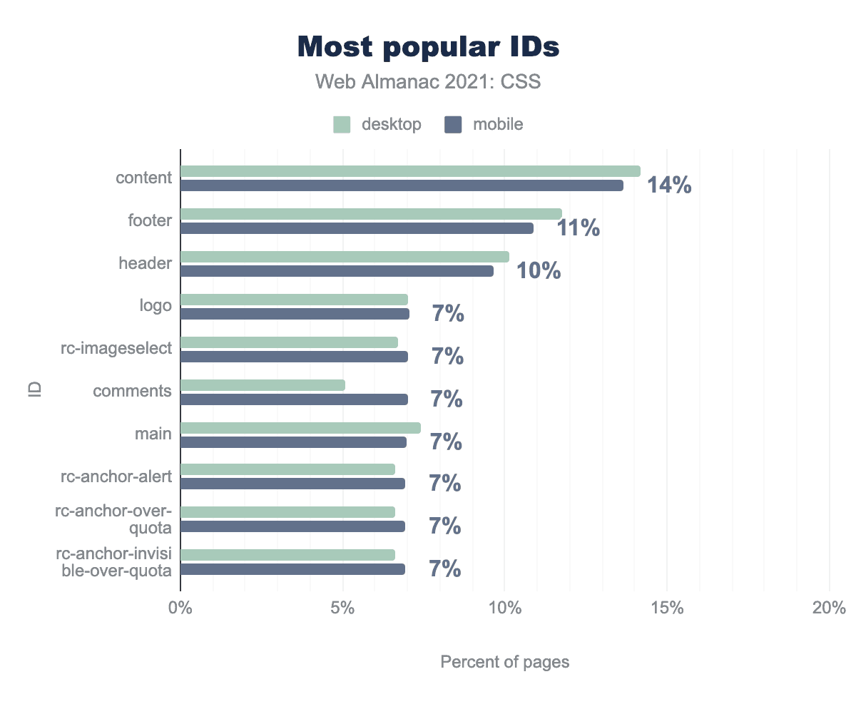 ページは引き続きIDを使用しており、その割合は2020年に見られたものとほぼ同じです。人気のあるID名のリストも一貫しています。”content”が約14%でトップに立ち、”footer”と “header”がそれに続きます。後者の2つのIDは、昨年に比べて約1%減少していますが、これだけで決定的なことは言えず、開発者は可能な限り対応するHTML要素の<header><footer>に置き換えるべきでしょう。