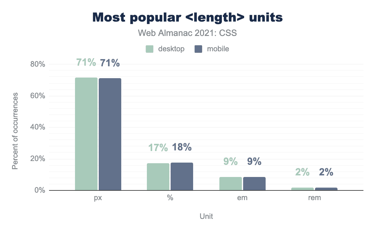 ピクセルの長さをどう思うかは別として、ピクセルは圧倒的に人気のある長さ単位で、全ページの約71%に登場しています。2位の「パーセンテージ」は、「ピクセル」に圧倒的な差をつけています。