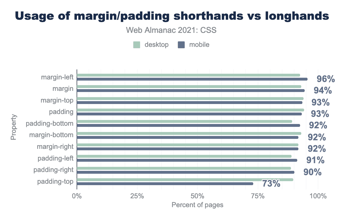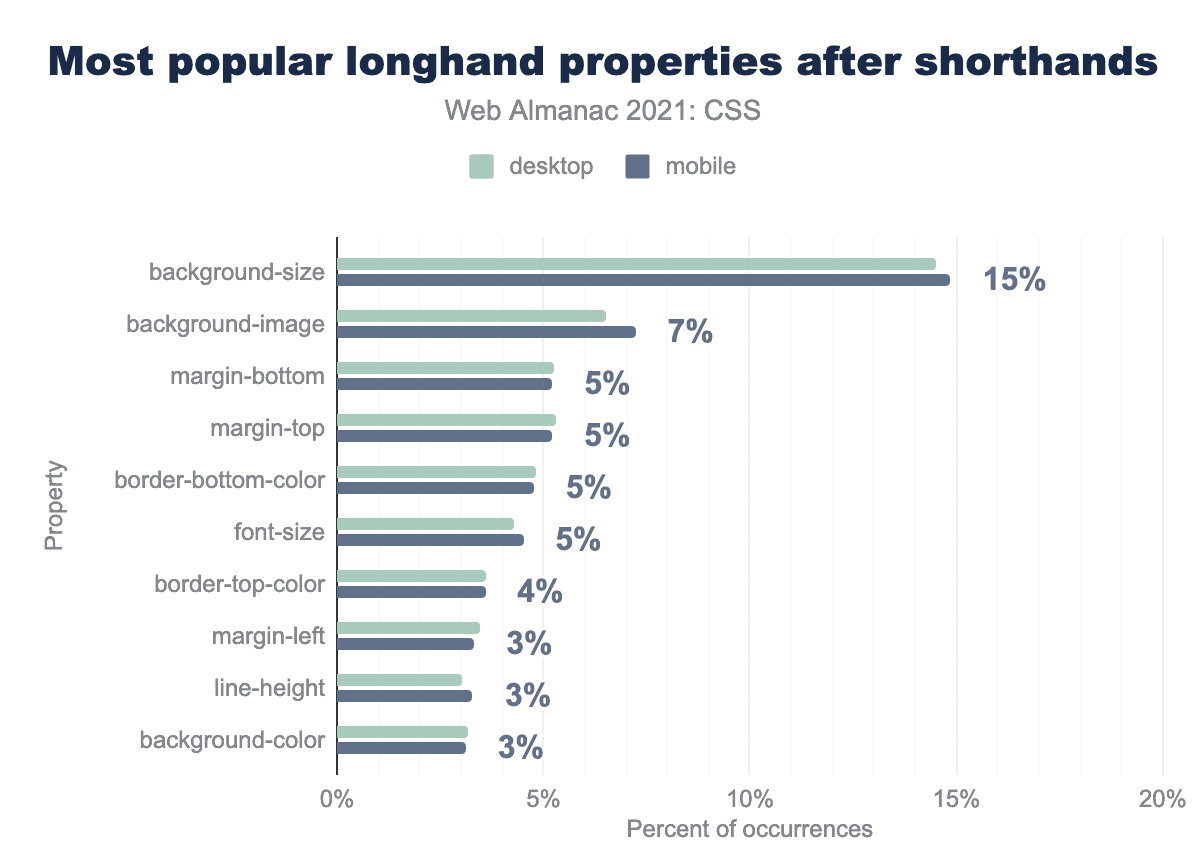 むしろ、これらを設定していないページがあったことに小さな驚きを感じました。圧倒的に96%のページがbackgroundというショートハンドを使用していますが、これは1996年のCSS1に遡ります。同年代のロングハンドプロパティも同様で、85%以上のページで適用されていることがわかりました。