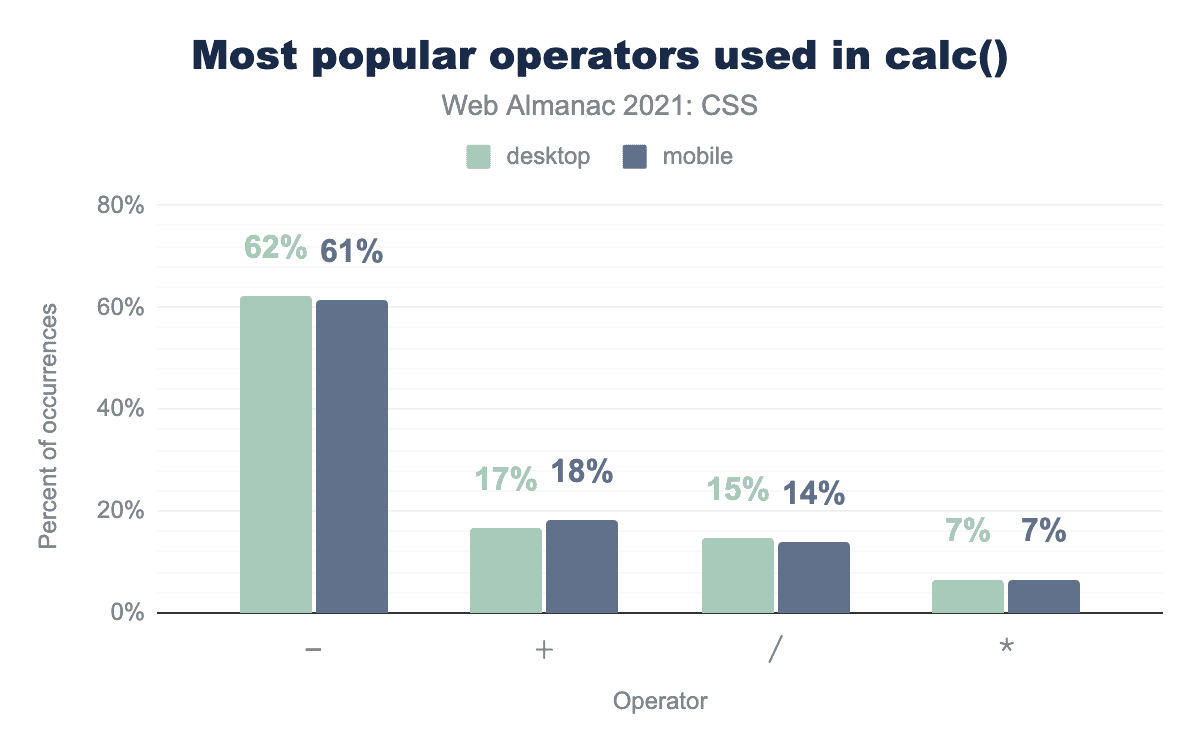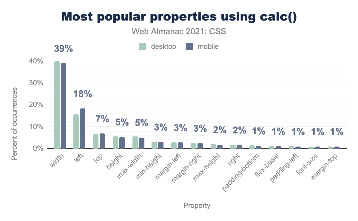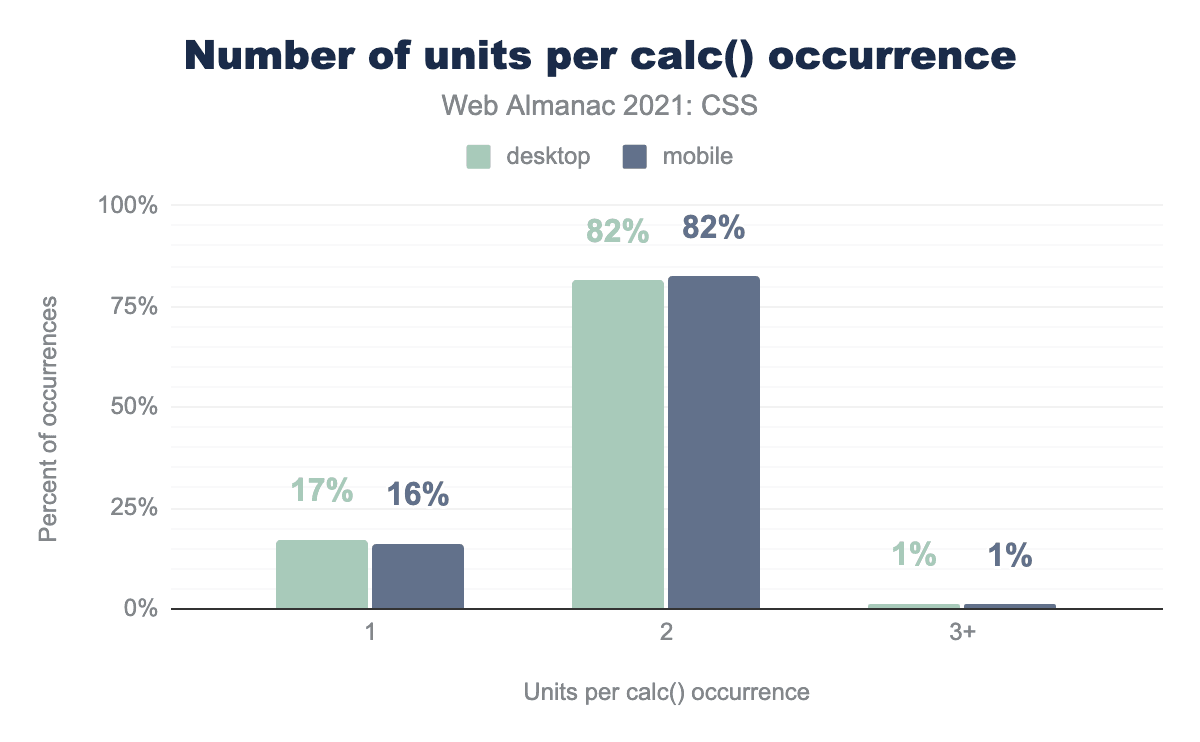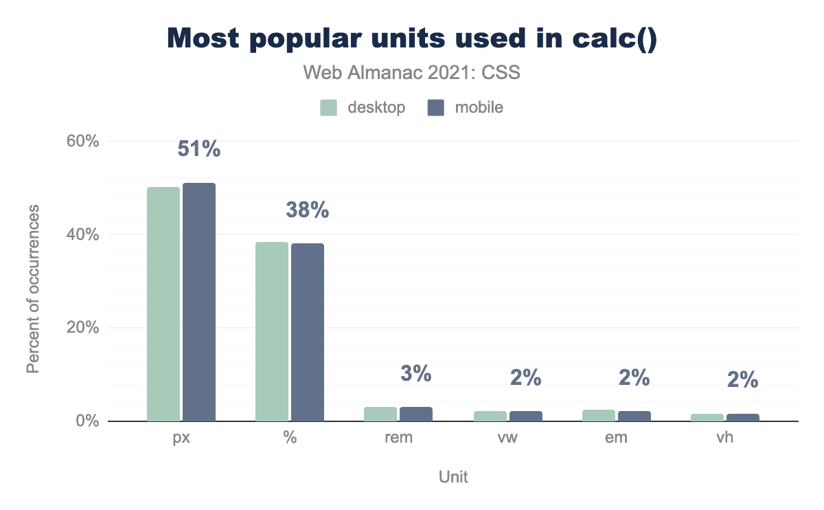 calc()の値は比較的シンプルで、パーセント値の計算結果からピクセルを引くなど、2つの異なる単位を使った計算が圧倒的に多いです。全calc()式の99%は、1種類または2種類の単位を使用しています。