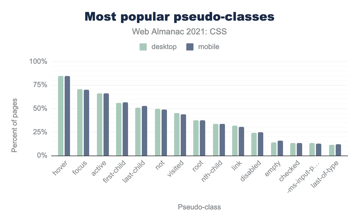 2020年と同様に、ユーザーアクション擬似クラスの :hover, :focus, :active がトップ3を占め、いずれも全ページの3分の2以上に登場しています。構造的な擬似クラスも数多く登場しましたが、もっとも興味深い変化は、否定の擬似クラスである :not():visited よりも人気を博し、ページの50%のシェアを獲得したことです。