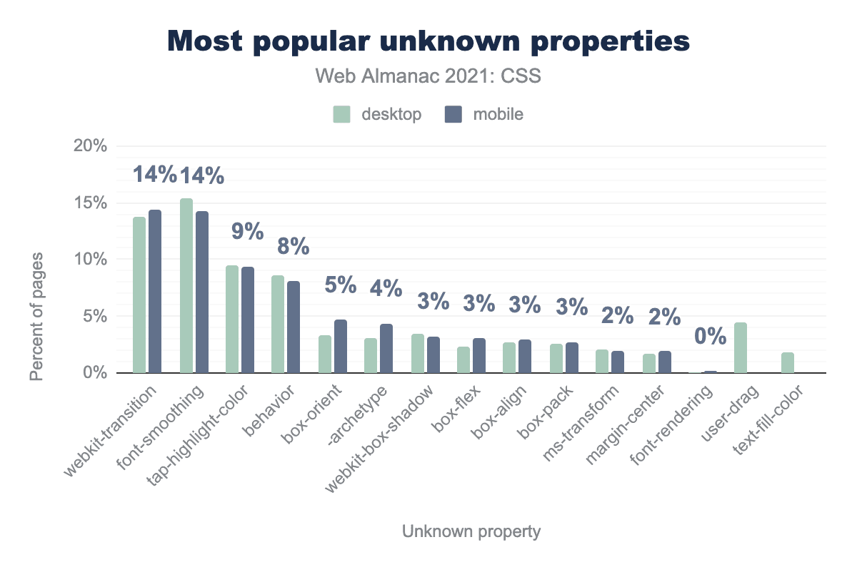 私たちがチェックしたいことのひとつに、構文的には有効だが、実際には存在しないプロパティを使用している宣言の存在があります。これは、ベンダー接頭辞付きのプロパティは数えませんが、不正なベンダー接頭辞付きのプロパティは含みます。実際、もっとも広く見られた存在しないプロパティはwebkit-transition(適切なベンダープレフィックスに必要な先頭の-がない)で、存在しないプロパティを含むすべてのページの14%に見られました。本質的に結びついていたのは font-smoothing で、これは -webkit-font-smoothing の接頭辞なしのバージョンで、実際には存在しませんし、すぐに存在する可能性もありません