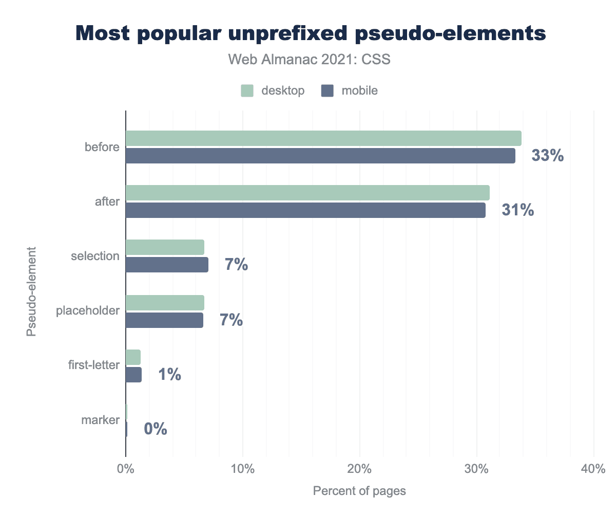現在使用されている擬似要素のほとんどは、特定のインタフェースコンポーネント、chromeの一部、またはハイライトされたテキストなどを選択するためのブラウザ固有の方法です。これらを除外すると、::first-letterが使用されているページは非常に少ないことがわかりますが、それでも::first-lineよりは多くのページで使用されていることがわかります。::marker は、箇条書きやカウンターのようなリストアイテムのマーカーを順序付きリストとして選択する方法で、ページシェアは1%にも満たないが、リストに入っています。ここで注意すべきなのは、::markerのクロスブラウザサポートは、比較的新しいということです(2020年10月)。今後数年間で利用者が増えるかどうかが注目されます。