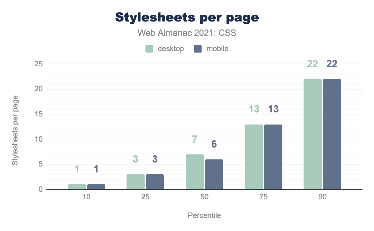 埋め込み型、外部型を問わず、1ページあたりのスタイルシート数の平均は、昨年よりもわずかに増加しています。50パーセンタイルから90パーセンタイルまではそれぞれ1つずつ増加しましたが、10パーセンタイルと25パーセンタイルは変化がありませんでした。