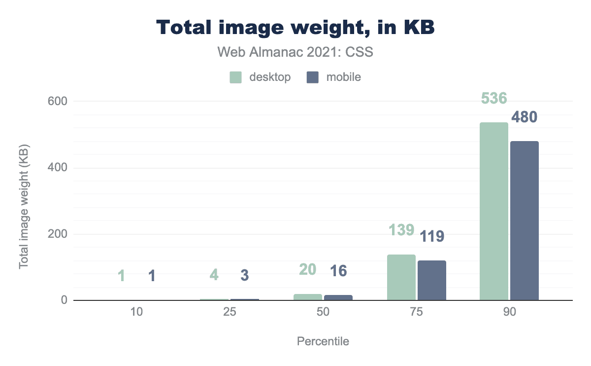 CSSはほとんどのページでもっとも重いコンポーネントではありませんが、ウェブの他の部分と同様に、年々そのサイズは増加し続けています。ウェブページの中央値では約7KBのCSSがロードされ、上限値では平均4分のMB強となっています。2020年と比較すると、CSSの総重量の中央値は約7.9%増加し、90パーセンタイルは7%弱増加していますが、すべてのパーセンタイルでモバイルCSSがデスクトップCSSよりも少し小さいという昨年のパターンは維持されています。