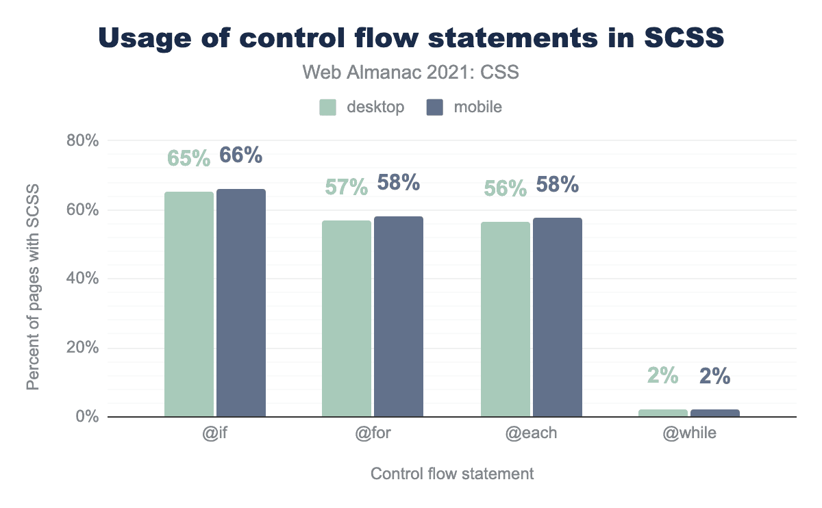 この同じ欲求は、@ifのようなSassのフロー制御構造の使用でより明確に見ることができます。文字通り、すべてのSassスタイルシートの3分の2が @if を使用しており、半分以上が @for または @each(またはその両方)を使用しています。この人気の機能は、最近CSSに追加されました。対照的に、@while構造を使用しているのはわずか2%です。