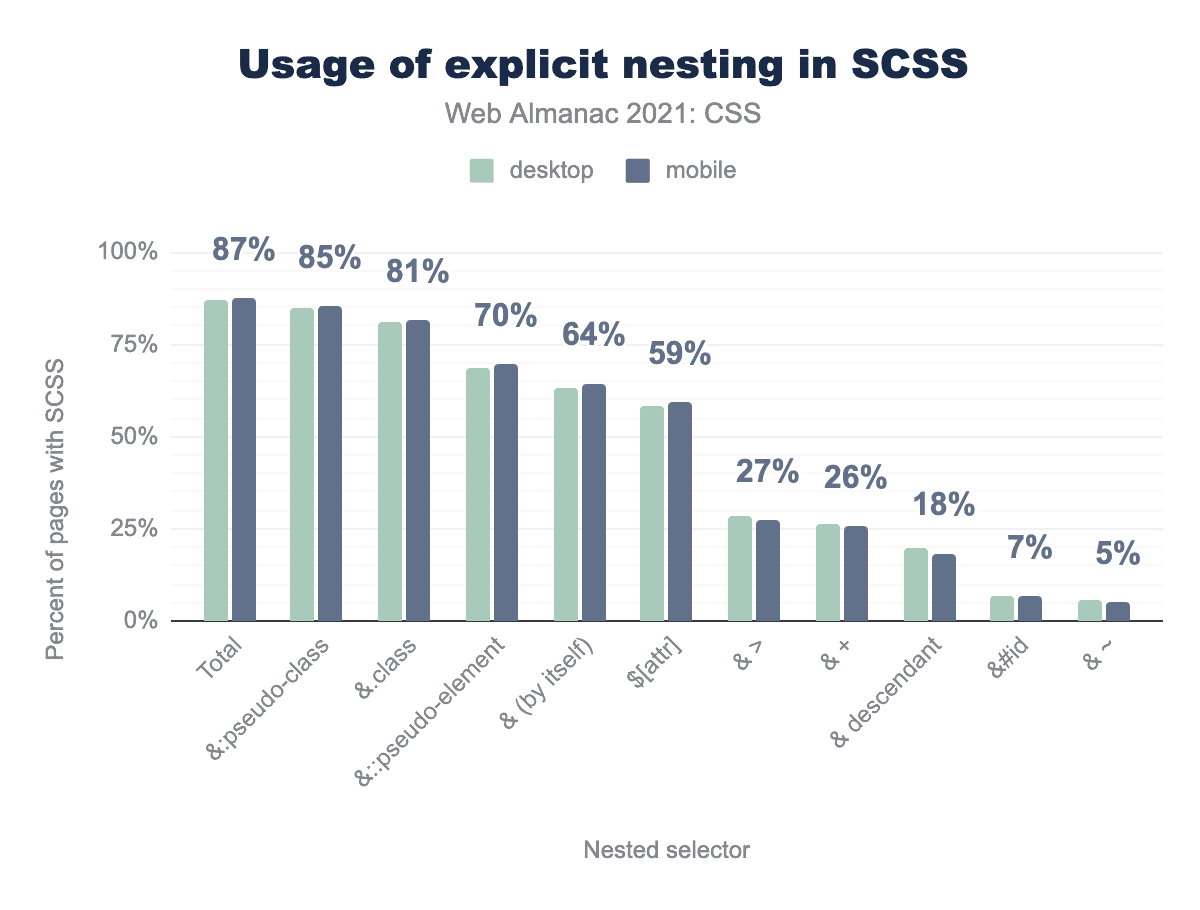Sassのもう1つの大きな魅力は、他のルールの中にルールを入れ子にできるので、繰り返しのセレクタパターンを書く必要がないことです。この機能は、ネイティブのCSSで開発中であり、その理由を我々の分析が示しています。すべてのSassスタイルシートの87%が、検出可能な形式のルールの入れ子を使用しています。特殊文字を必要としない暗黙的なネスティングは測定されませんでした。