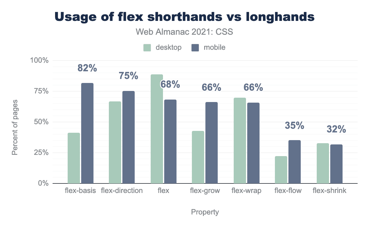 Flexboxのロングハンドとショートハンドのプロパティの中には、激動の歴史を持つものもあります。たとえば、CSS Flexboxの仕様自体、作者が flex-growflex-shrinkflex-basis の使用を避け、代わりに flex ショートハンドを使用することを推奨しています。これにより、設定されていないプロパティが適切な値を持つようになります。残念ながら、実際にはこれはうまくいっていないようで、モバイルページでは flex-basisflex よりも多く使用されており、その差は10%以上にもなります。