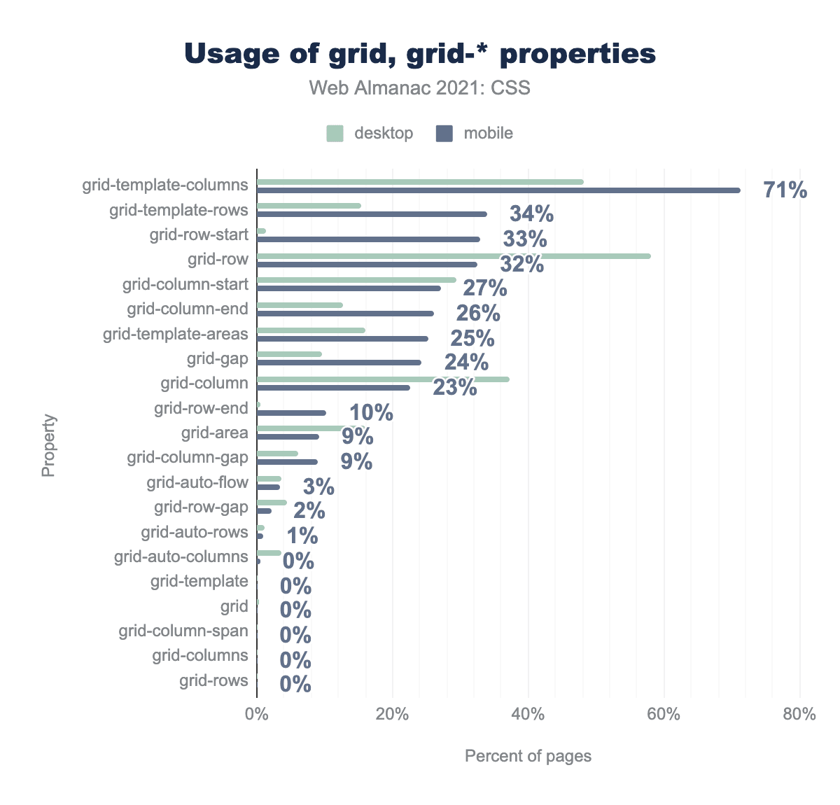 ここ数年の傾向として、グリッドのショートハンドプロパティ(grid-templategridなど)は、それらが包含するロングハンドプロパティよりもはるかに少ない頻度で使用されていることがわかっています。 実際には、両方とも0%という驚異的な数字で、ランキングでは隣り合っています。残りの略語はすべてこの2つに集約されており、grid-template-rowsgrid-columnなどのロングハンドのプロパティは広く使用されています。実際、注目すべき使用率の高いロングハンドプロパティはgrid-gapだけで、モバイルのグリッドページでは24%の使用率となっています。今後、より新しい、そして一般的なgapgrid-gapを追い越すかどうか、興味深いところです。