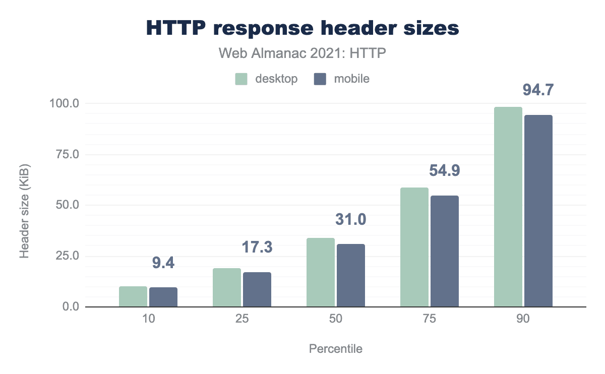 ウェブページの中央値では、デスクトップで34KB、モバイルで31KB相当のヘッダーが返されます。90パーセンタイルでは、デスクトップで98KB、モバイルで94KBに増加します。しかし、レスポンスヘッダーの最大のインスタンスは5.38MB以上でした。多くのサイトで、1MBを超えるレスポンスヘッダーが発見されました。一般的に、これらの大きなレスポンスヘッダーは、オーバーウェイトの CSP または P3P ヘッダーが原因であり、ウェブサイト間でこれらのヘッダーの複雑さや誤った管理を示唆しています。他の極端な例では、複数の Set-Cookies や Cache-Control の設定を重複させるアプリケーションの設定ミスやエラーが原因で、ヘッダーが過大になっています。