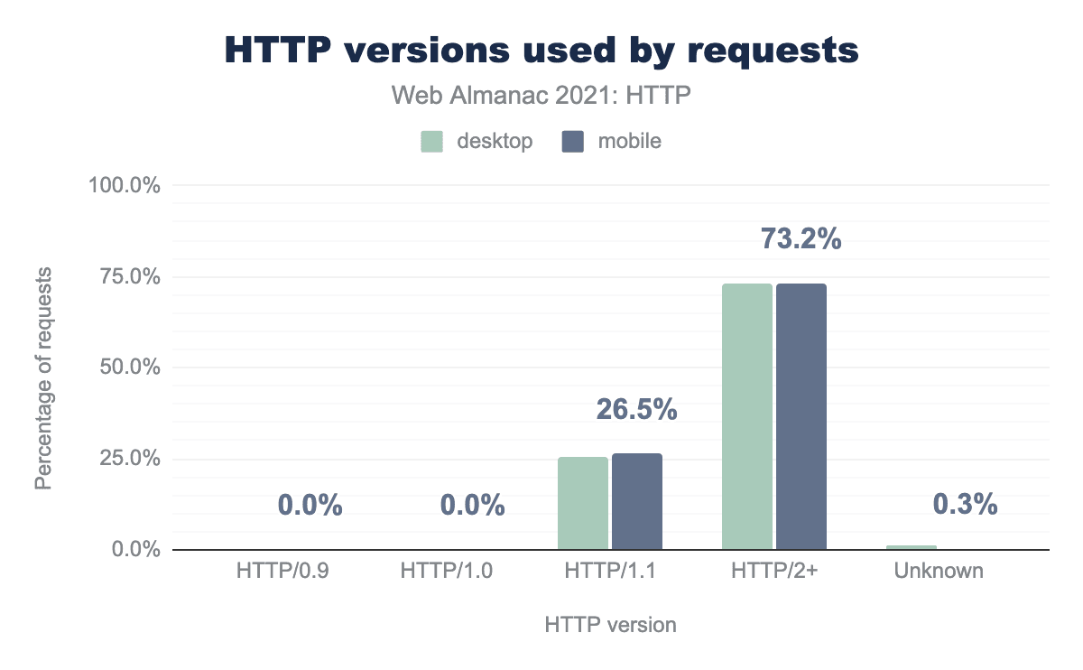 2021年、HTTP Archiveのデータは、HTTP/0.9とHTTP/1.0が事実上すべて消滅したことを示唆しています。0.9には数百のリクエストが存在しましたが、データセット全体で集計するとゼロに切り捨てられます。HTTP/1.0は数千のリクエストがありますが、これも全体の0.02%に過ぎません。