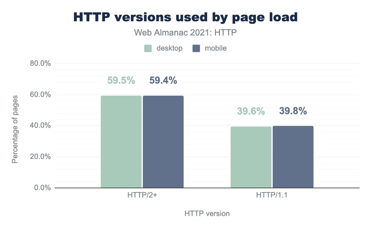 HTTPバージョン0.9から30年の間に、プロトコルの採用状況に変化がありました。600万以上のウェブページを分析した結果、HTTP Archiveは最初のページリクエストにHTTP 0.9を使用した例は1つだけで、1.0を使用しているページはわずか数千件であることを発見しました。しかし、ほぼ40%のページがバージョン1.1を使用しており、残りの60%はHTTP/2以上を使用しています。このように、HTTP/2の採用率は、2020年に同じ分析を行ったときよりも10%増加しています。