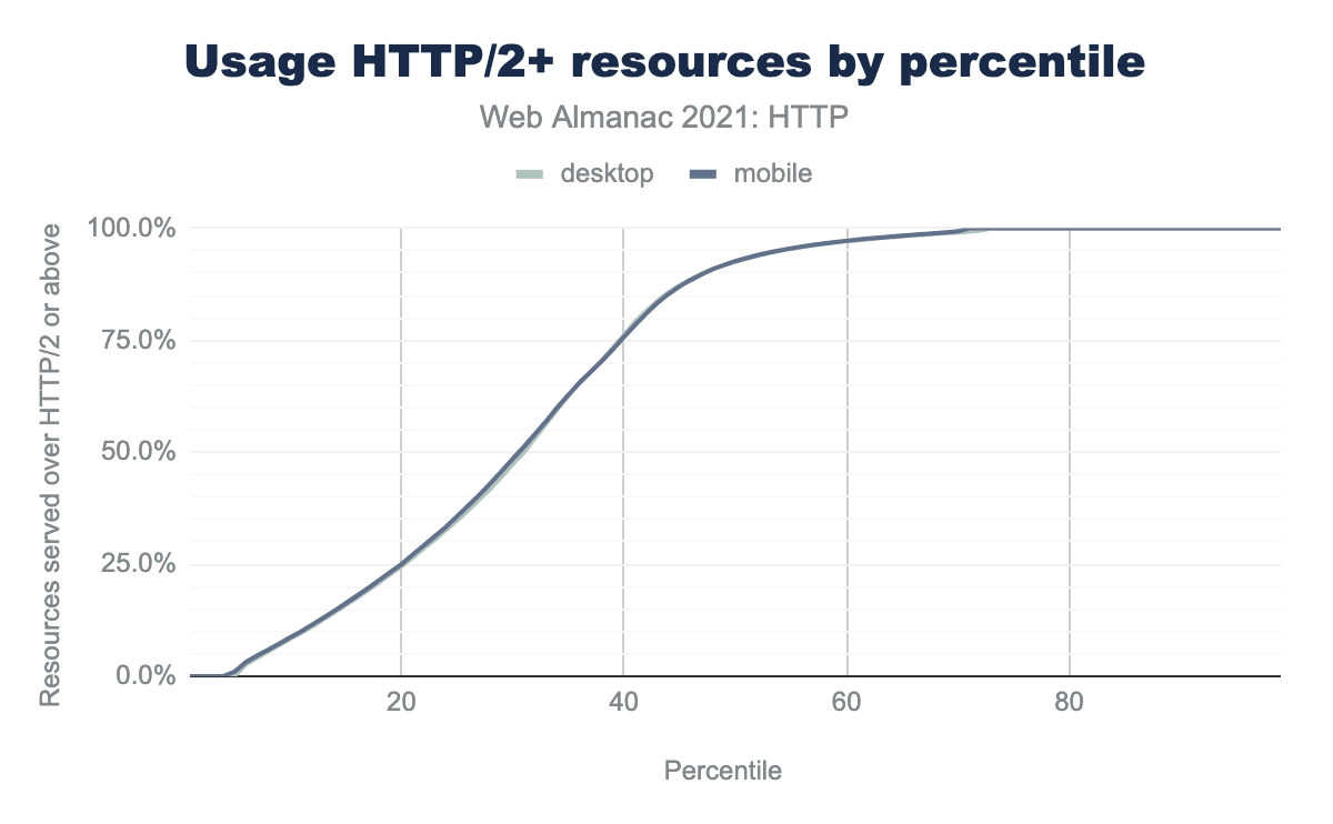 50パーセンタイル以上のページでは、リソースの92%以上がHTTP/2+ で提供されています。そして70パーセンタイル以上では、100% のサイトのリソースがHTTP/2以上で読み込まれています。別の言い方をすれば、30%のサイトがHTTP/1.1のリソースをまったく使用していないことになります。