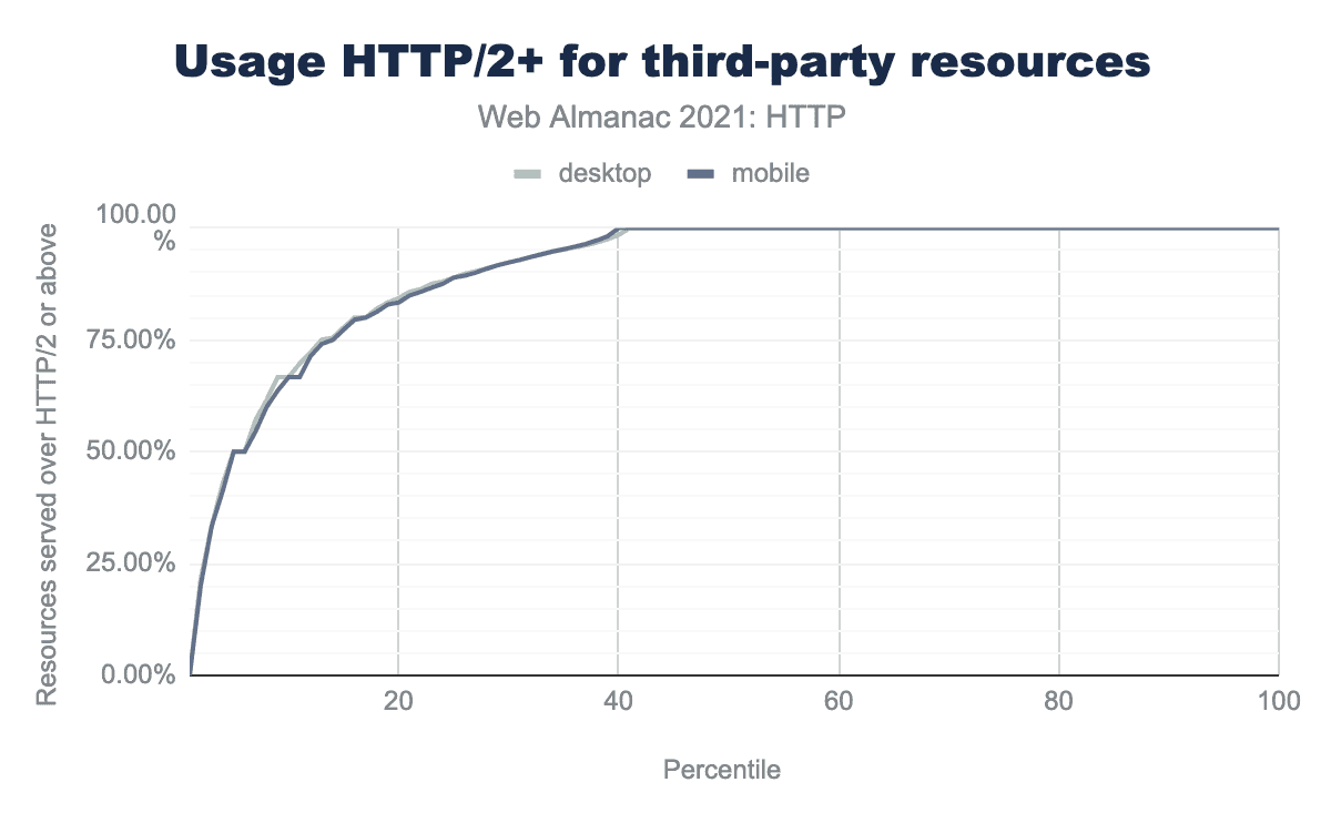 サードパーティコンテンツによるHTTP/2の採用は非常に偏っており、サードパーティのリクエストの40パーセンタイルを超えると、100%のトラフィックがHTTP/2で提供されるようになります。実際、10パーセンタイルでも、66%以上のリクエストがHTTP/2を活用しています。このことから、導入の大半はまだサードパーティコンテンツとCDNを活用したドメインが提供するコンテンツに影響されていることがわかります。
