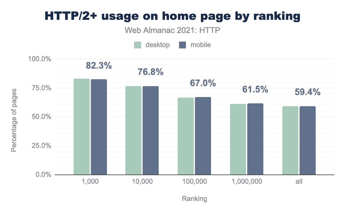 また、HTTP ArchiveにおけるサイトのページランクとHTTP/2への対応には直接的な相関があります。トップ1,000に掲載されているサイトの82%がHTTP/2を有効にしています。上位1万サイトでは76%以上、次いで上位10万サイトで66%、そして上位100万サイトは少なくとも60%がHTTP/2を有効にしていることになります。このことは、ランキング上位のサイトが、提供されるセキュリティとパフォーマンスの利点を求めてHTTP/2を有効にしていることを示唆しています。ランキング上位のサイトほど、HTTP/2を有効にしている可能性が高くなります。