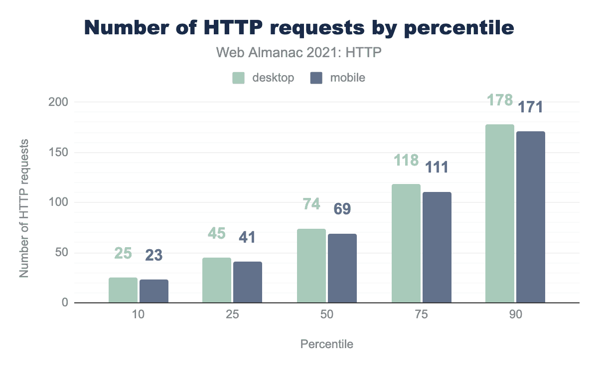デスクトップ用サイトの中央値は74リクエスト、モバイル用サイトの中央値は69リクエストです。1ページあたりのリクエスト数が数千を超えるサイトも何百とありました。もっとも高かったのは、合計17,923リクエストで、次いで10,224リクエストとなっています。HTTP/2は、以前のリクエストで送信されたヘッダーを圧縮して再利用することで、繰り返されるリクエストの影響を軽減しています。