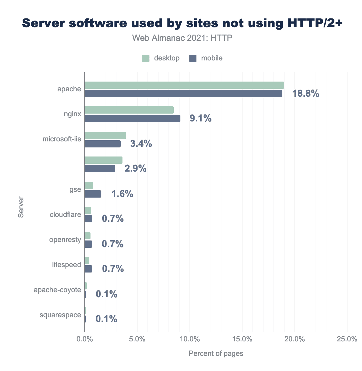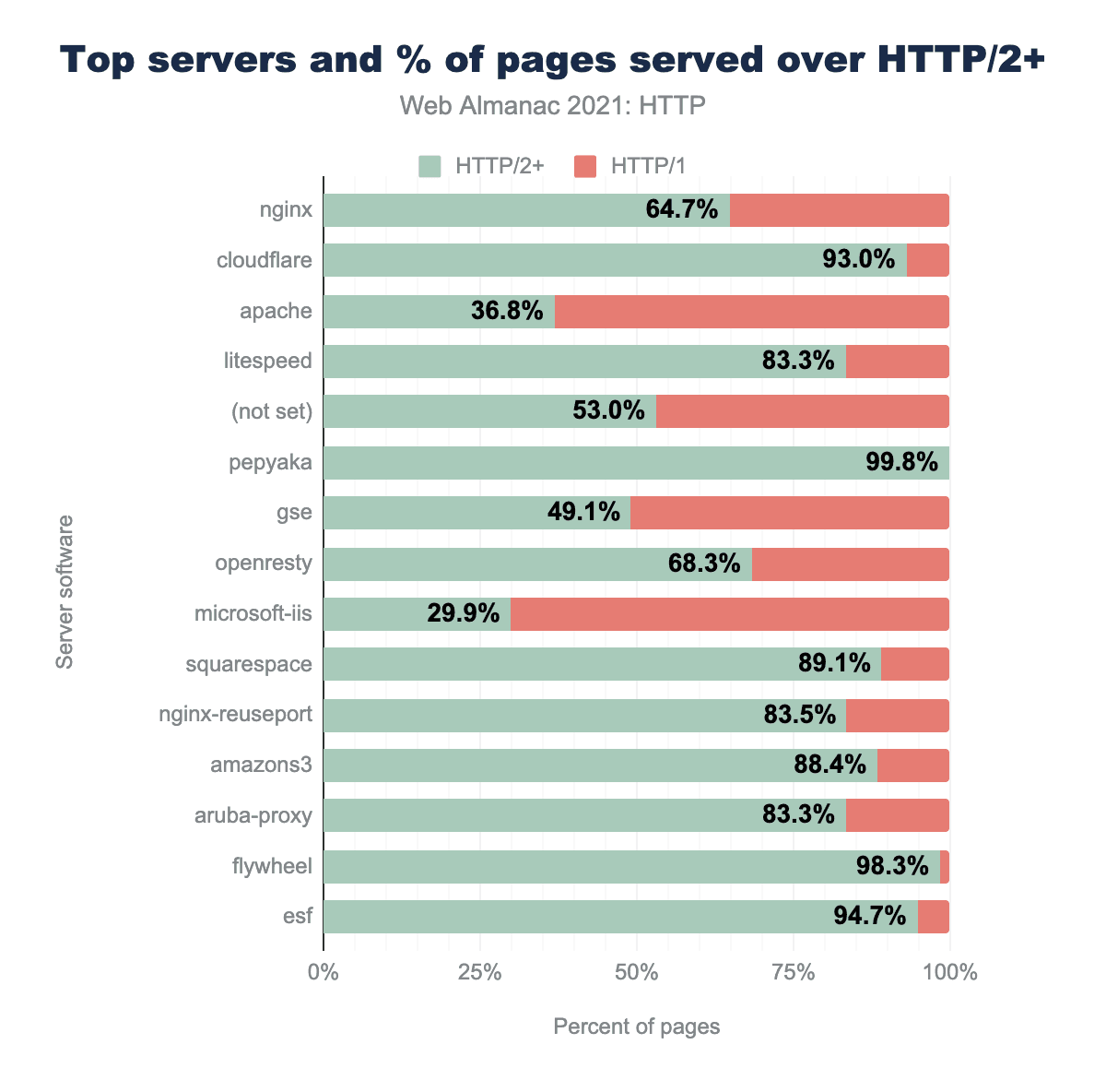 ブラウザ間での高い普及率とHTTPSの高い普及率から、HTTP/2のさらなる普及を制限する要因は、まだサーバーの実装に大きく左右されることを理解することが重要です。HTTP/2の利用が急速に増加しているにもかかわらず、ウェブサーバ別に分けた場合、採用の数値はより断片的なストーリーを示しています。