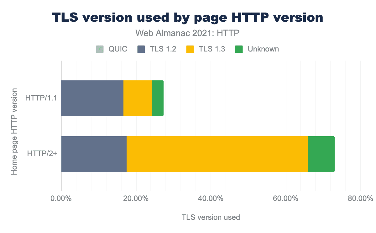 HTTP Archiveのデータによると、デスクトップページの34%がTLS 1.2を、56%がTLS 1.3を使用しており、残りの10%は不明(接続に失敗したHTTPSサイトなど)です。モバイルではやや低く、36%がTLS 1.2、55%がTLS 1.3、9%が不明となっています。大半のサイトがTLS1.3を使用していますが、Webサイトの3分の1はアップグレードすることで、これらのパフォーマン スを向上させることができます。