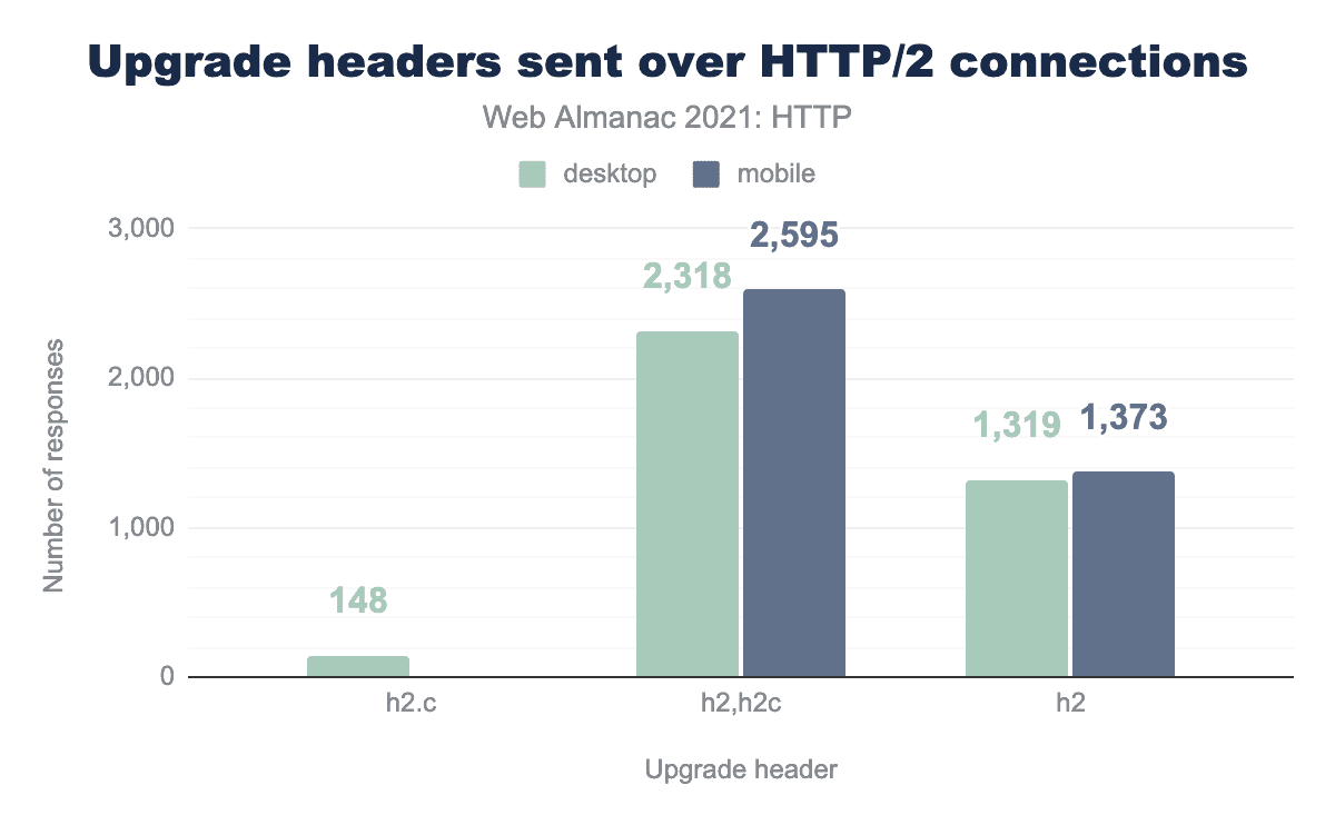 HTTP Archiveのデータによると、Upgradeヘッダーの使用は、しばしば誤用されたり、正しく設定されなかったりすることがあるようです。この機能は、実際、HTTP/2の次のバージョンから 削除 される予定です。Upgradeヘッダーを提供しているサイトはごく一部です。もっとも多く報告されているヘッダーは、HTTP/2オプション、またはHTTP/2 over cleartextの詳細を示す h2,h2c で、デスクトップサイトの0.09% とモバイルサイトの0.16% がこのヘッダーを報告しています。