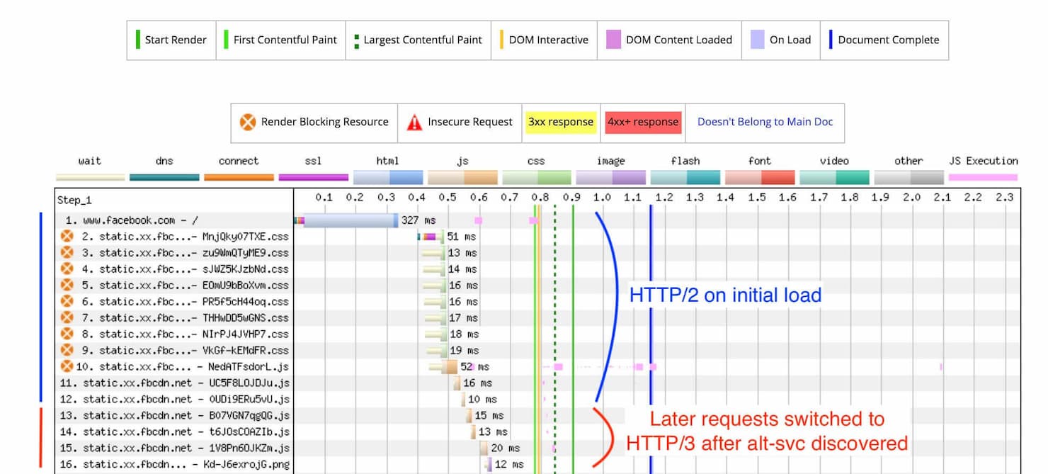 alt-svc が検出された後、HTTP3に切り替わります。また、コネクション合体(コネクションの再利用)により、2つのホスト名がDNS上で同じIPに解決し、同じTLS証明書とバージョンを使用する場合、クライアントは両方のホスト名で同じコネクションを再利用できる場合があります。したがって、使用するホストとTLS証明書の数に応じて、HTTP/2とHTTP/3の両方が混在するウォーターフォール リクエストを目にすることは珍しくありません。