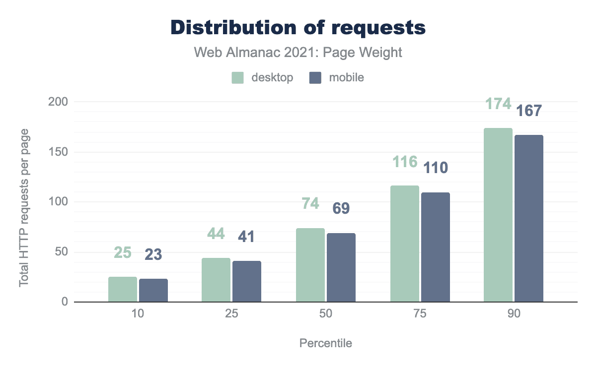 この章ですでに説明したように、リソースのサイズと同様に、リクエスト数もページの読み込み性能に悪影響を与える可能性があるため、ページの重みのもう1つの指標となります。